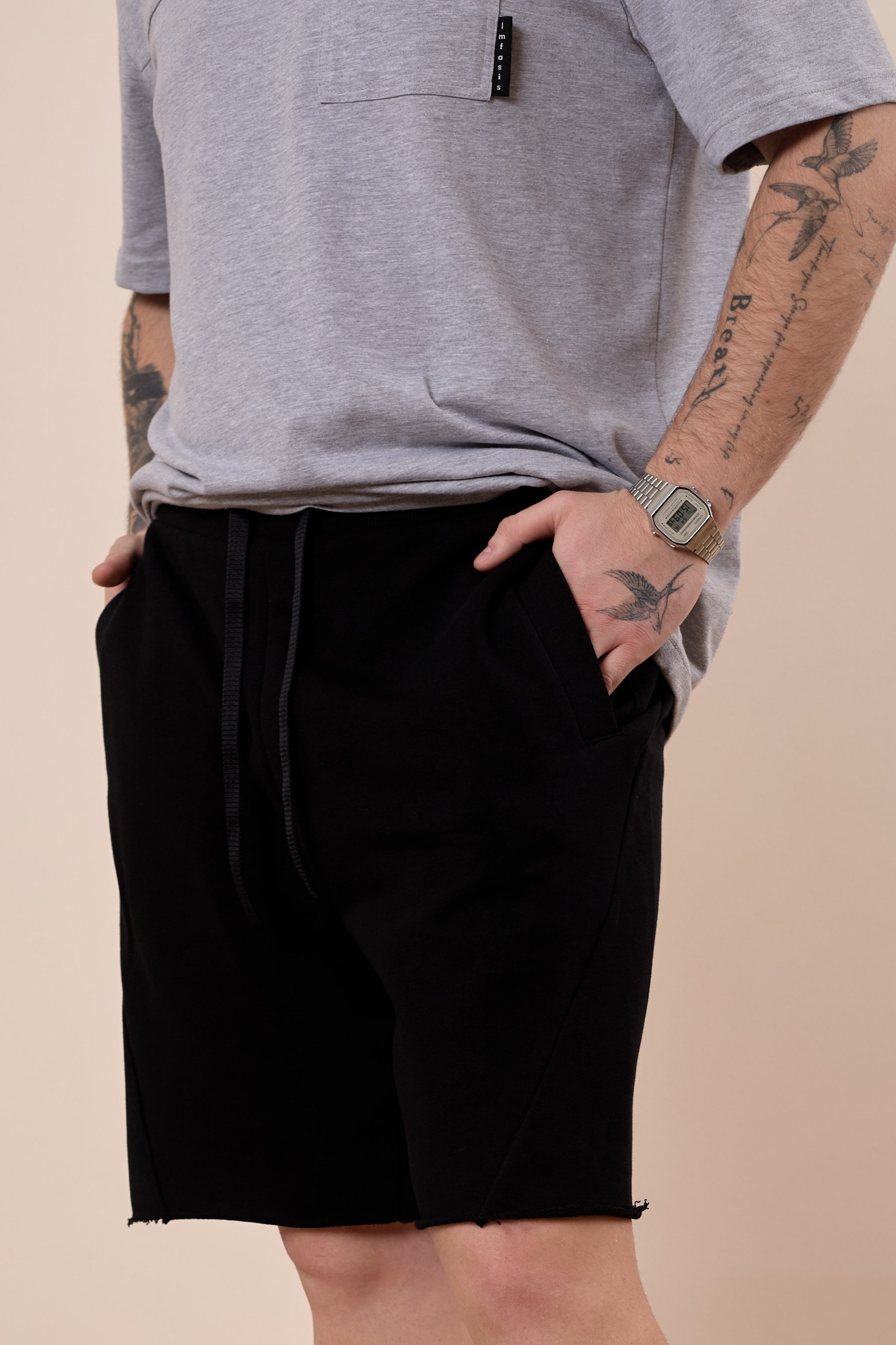 Шорты из футера 3-х нитки воздушка хлопок с притачным поясом из кашкорсе в цвет основного полотна. В пояс продернут шнур через петли. На передних половинках карманы "втачная листочка". Боковые швы сверху смещены в сторону задней половинки, а снизу - в сторону передней. Низ шорт необработанный. Длина шорт чуть выше линии колена.