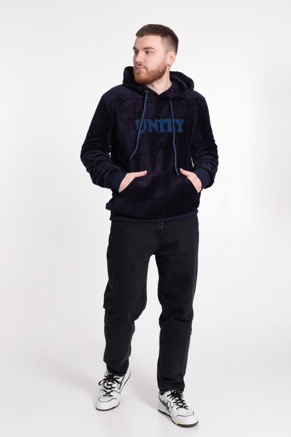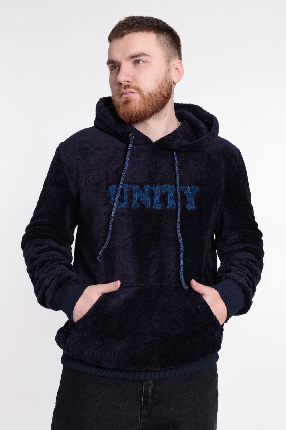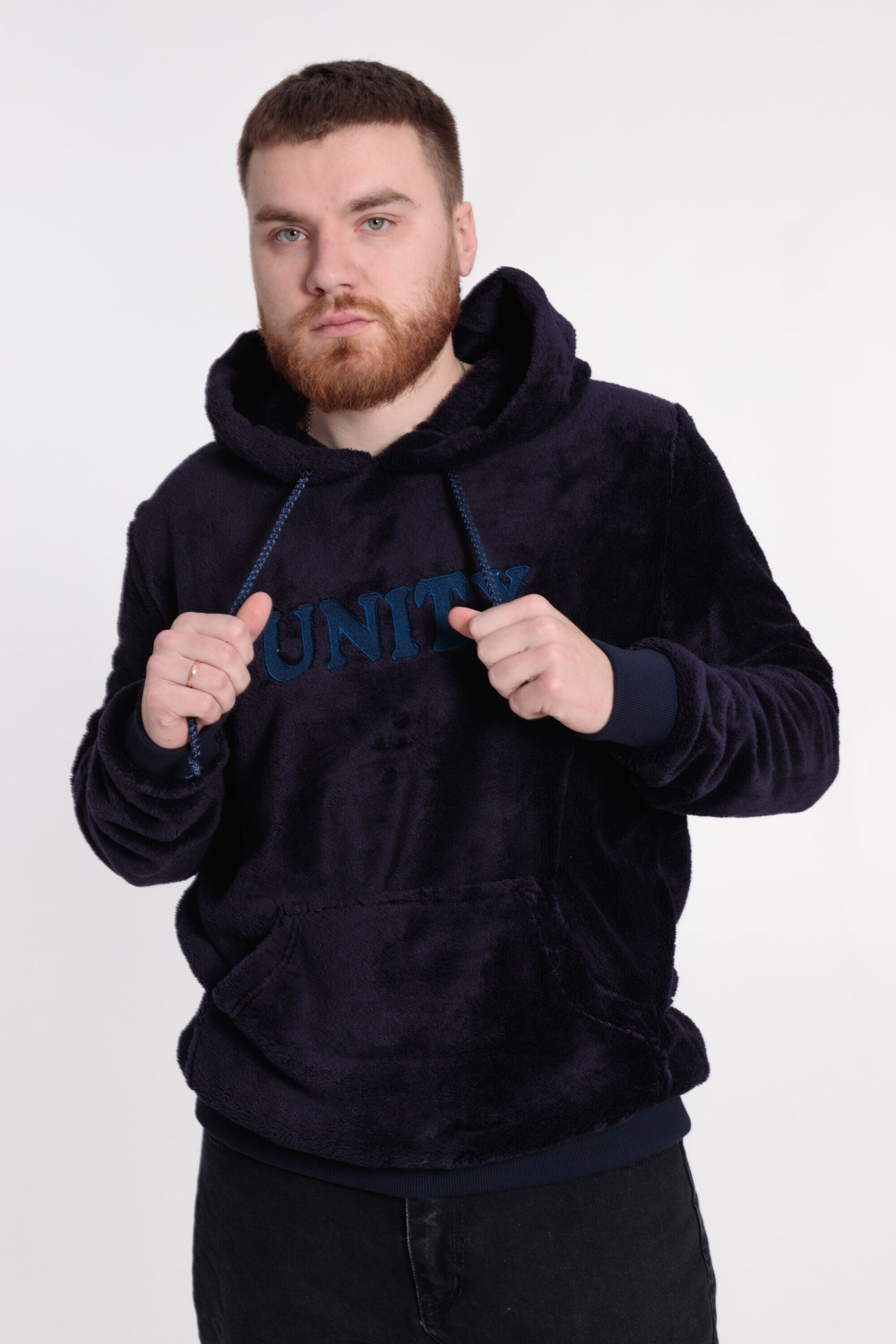 Мужская толстовка из велсофта. Ширина капюшона регулируется при помощи шнура. Спереди размещены вышивка и карман, пояс и манжеты из кашкорсе.