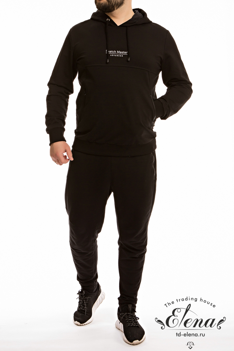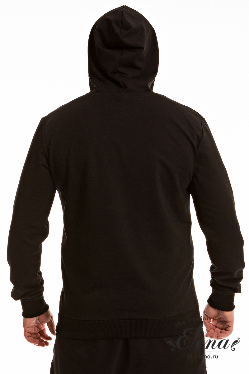 Мужская толстовка из футера петли с лайкрой черного цвета с капюшоном и длинными рукавами на манжетах обеспечивает комфорт в прохладную погоду. По бокам расположены два кармана на молнии, что позволяет удобно хранить мелочи или согреть руки. По низу толстовки притачной пояс обеспечивает хорошую посадку.