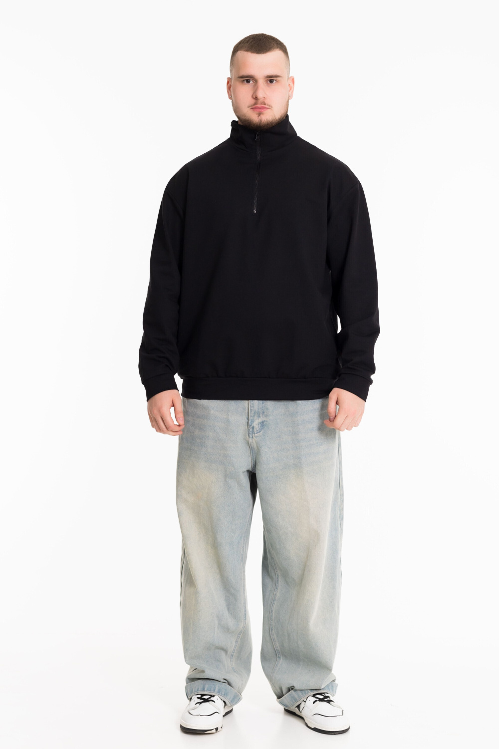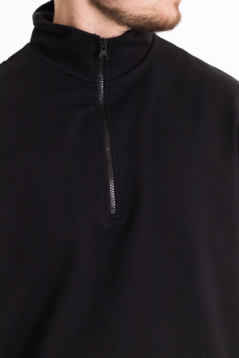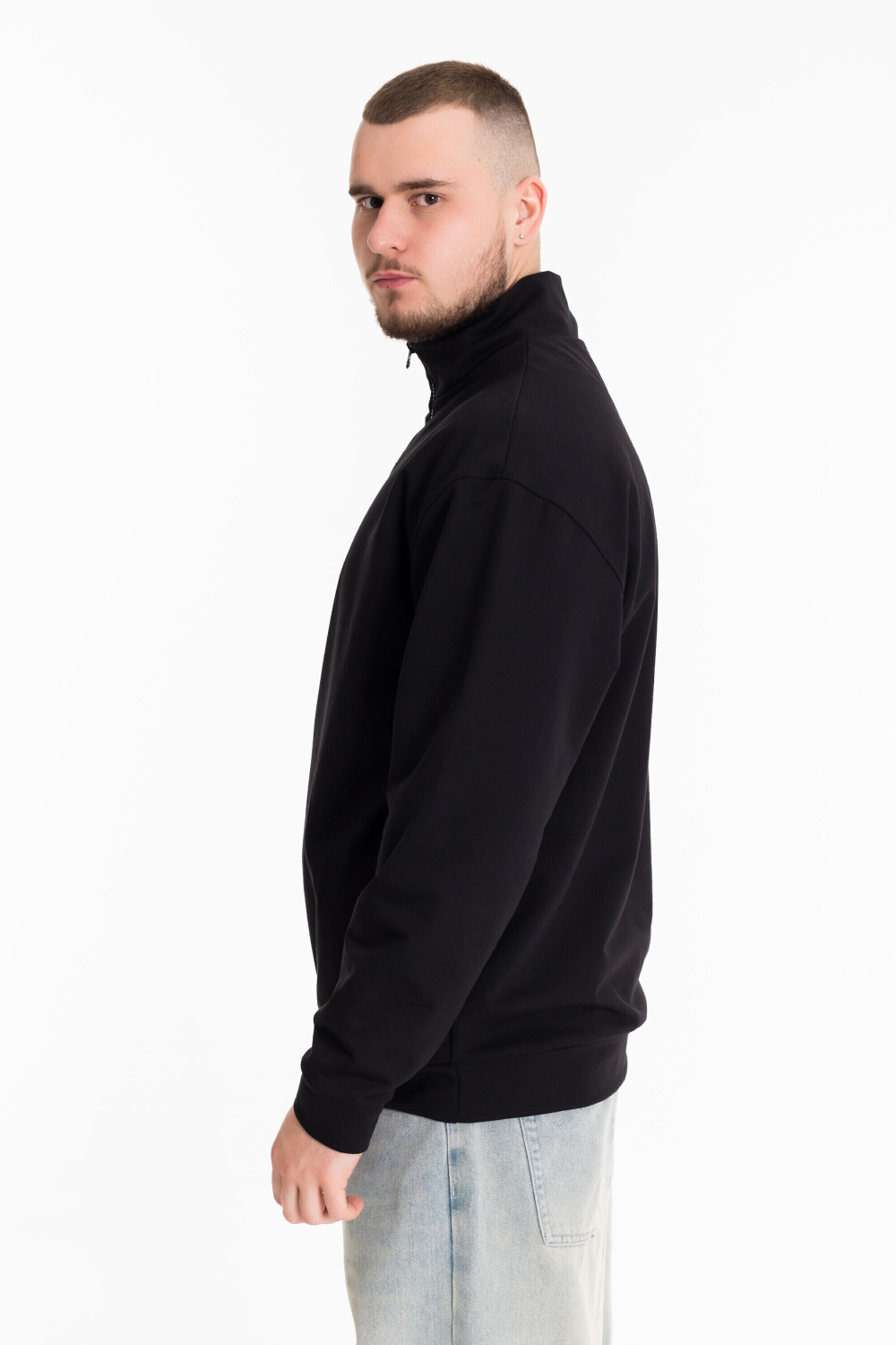 Толстовка из однотонного футера черного цвета идеально подходит для холодной погоды, сочетая комфорт и практичность с современным стилем. Однотонный черный цвет делает её универсальной для сочетания с различными элементами гардероба. Воротник-стойка с застежкой на короткую молнию не только защищает от ветра, но и добавляет изделию оригинальности. Спущенная линия плеча обеспечивает свободу движений и комфорт при носке. По бокам размещены карманы. Такая толстовка прекрасно подойдет для повседневной носки и будет отлично смотреться как с джинсами, так и со спортивными брюками.