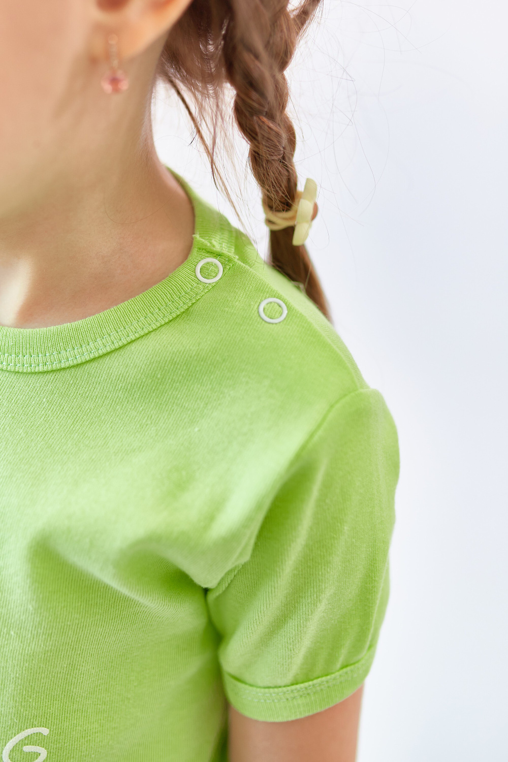 Детская футболка из однотонного ластика. Короткий рукав, круглый вырез горловины с застёжкой на кнопки. Спереди расположен принт.