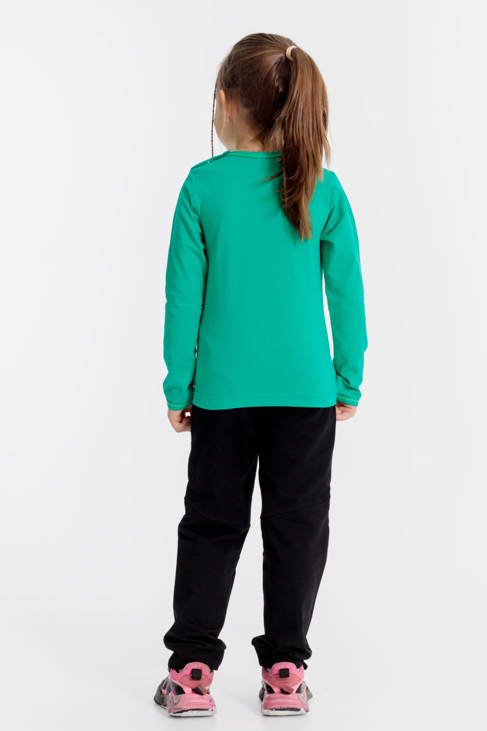 Футболка из хлопкового полотна, с длинным рукавом и круглым вырезом горловины. Застёжка на кнопки на плече. Спереди на футболке нанесён термопринт.