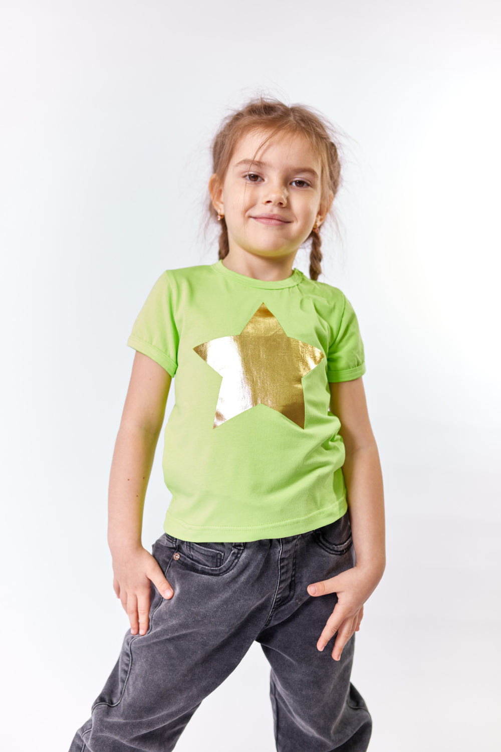 Футболка из однотонной кулирки с лайкрой. Короткий рукав, круглый вырез горловины с застёжкой на кнопки. Спереди расположен принт.