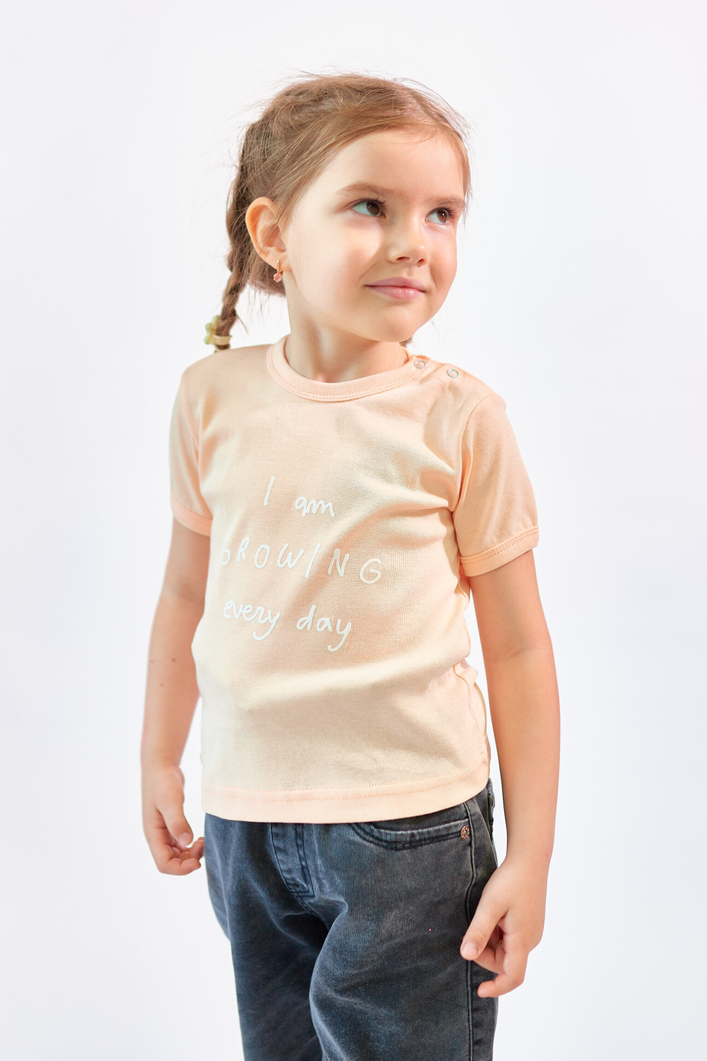 Детская футболка из однотонного ластика. Короткий рукав, круглый вырез горловины с застёжкой на кнопки. Спереди расположен принт.