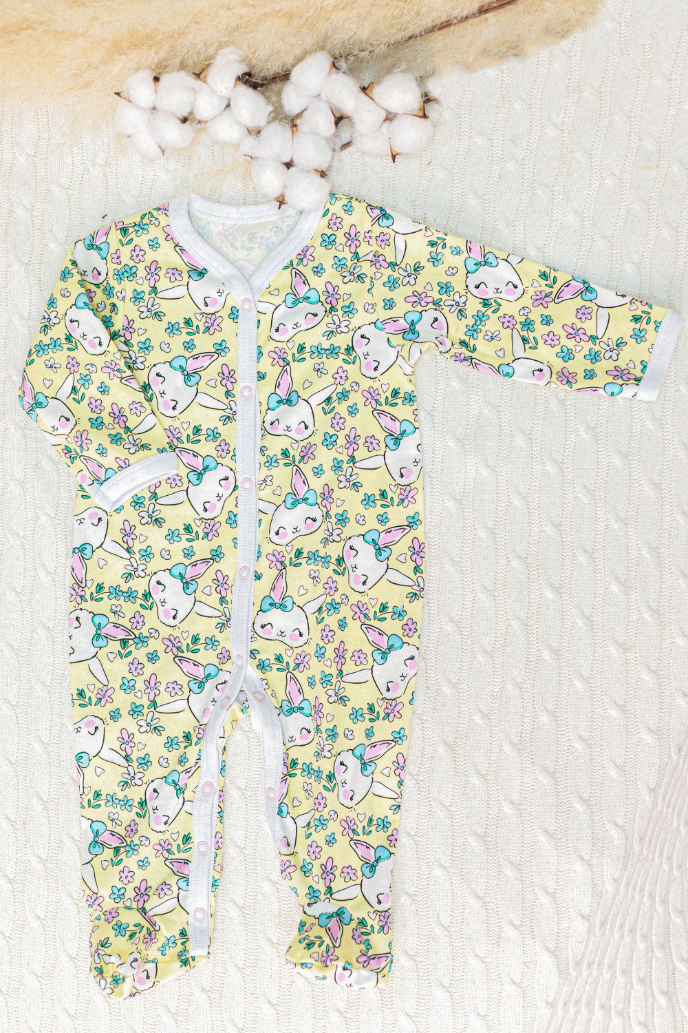 Комбинезон для новорожденных из интерлока желтого цвета с набивным рисунком зайки с цветами - милый и практичный выбор для вашего малыша.