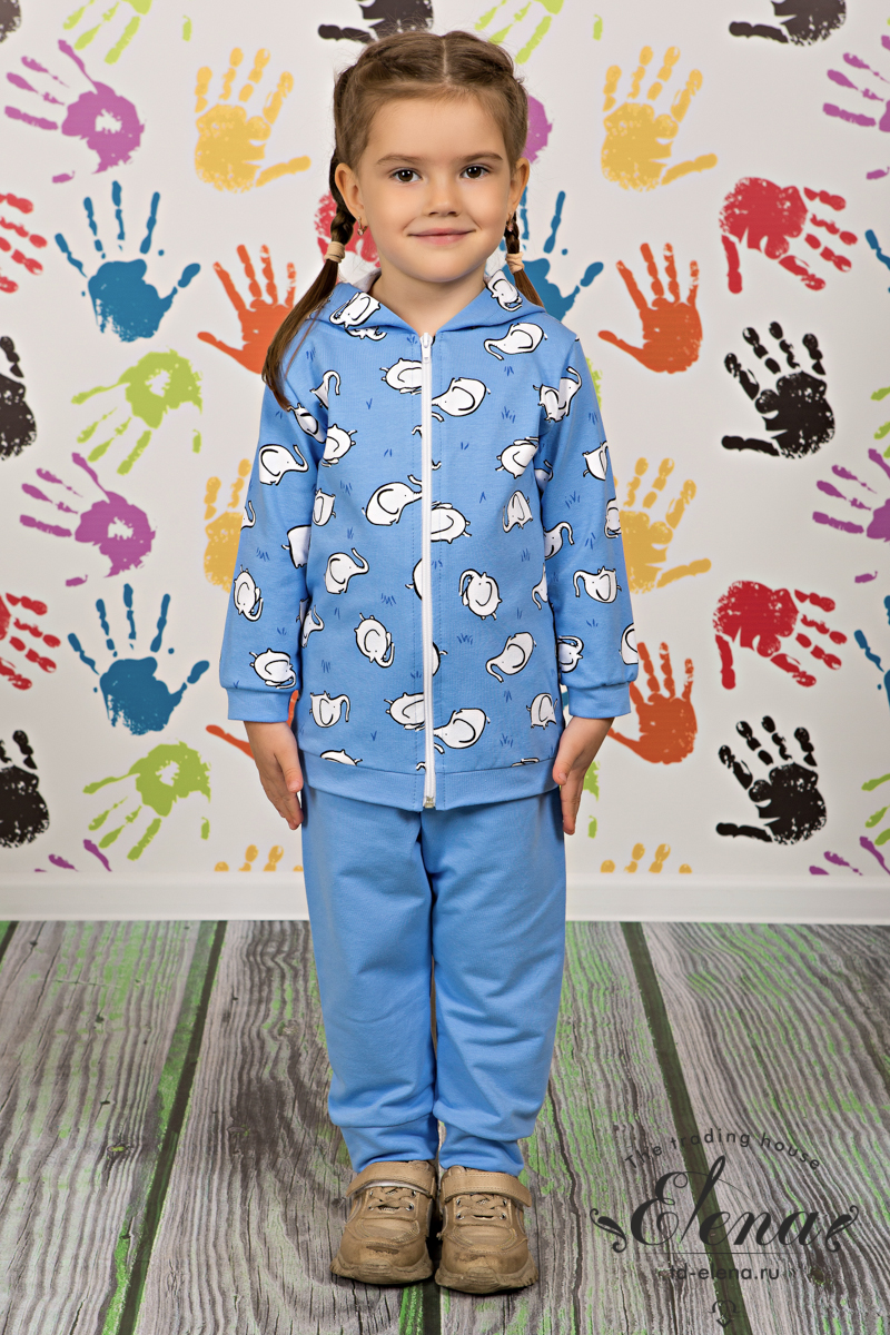 Детский костюм из футера c лайкрой, состоит из брюк и толстовки. Толстовка с капюшоном, длинными рукавами и центральной застёжкой на молнию. Брюки однотонные с притачной манжетой и поясом на резинке.