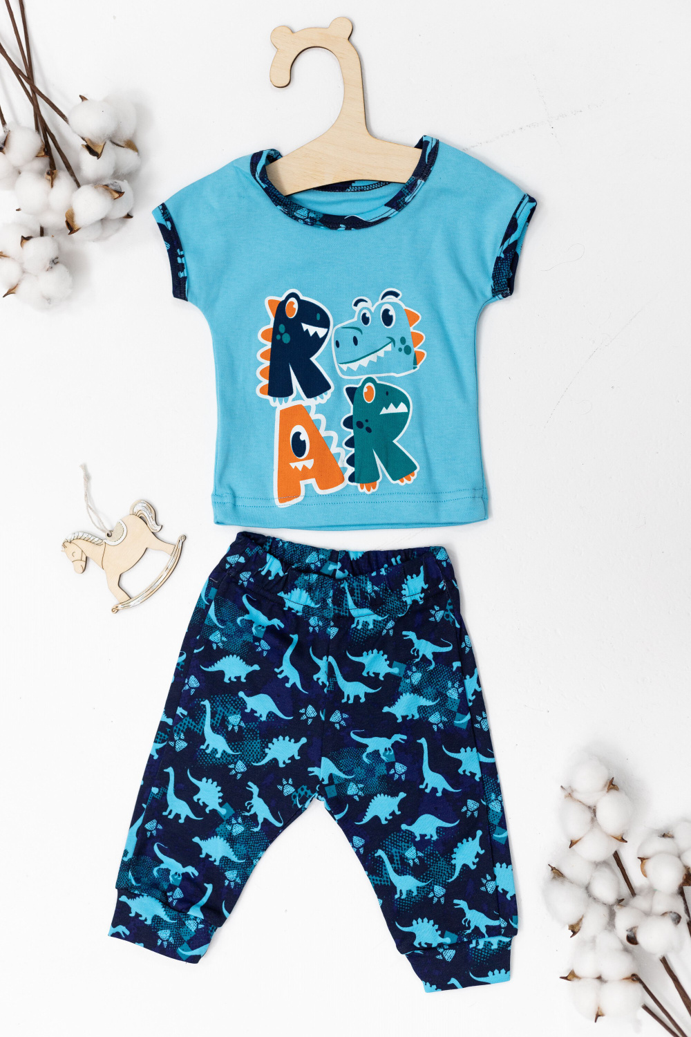Костюм выполнен из интерлока. Футболка с коротким рукавом и принтом спереди, проймы и горловина обработана бейкой. Брючки с поясом на резине и манжетами снизу.
