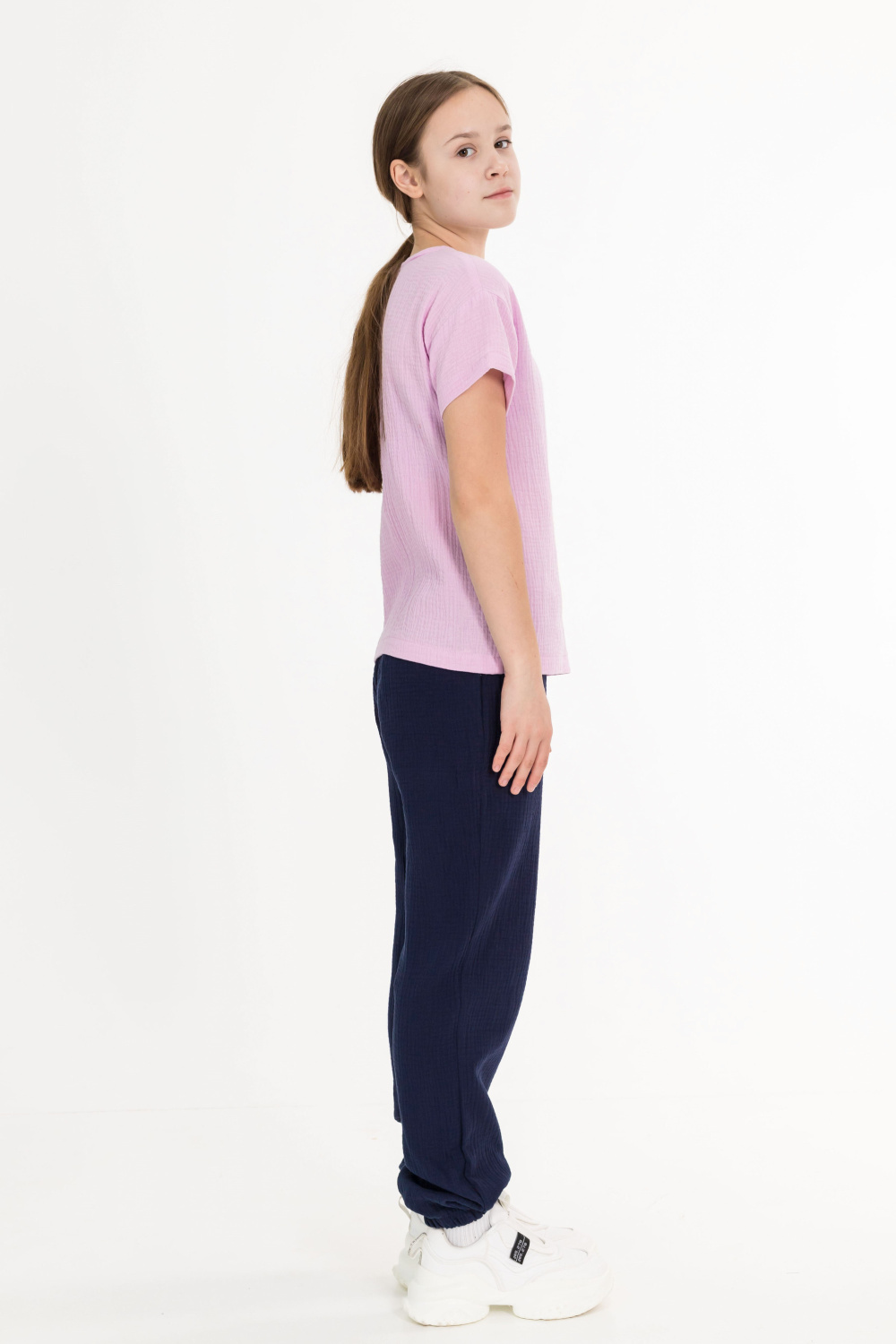 Детские летние брюки выполнены из муслина. Пояс и низ брюк на резинке.