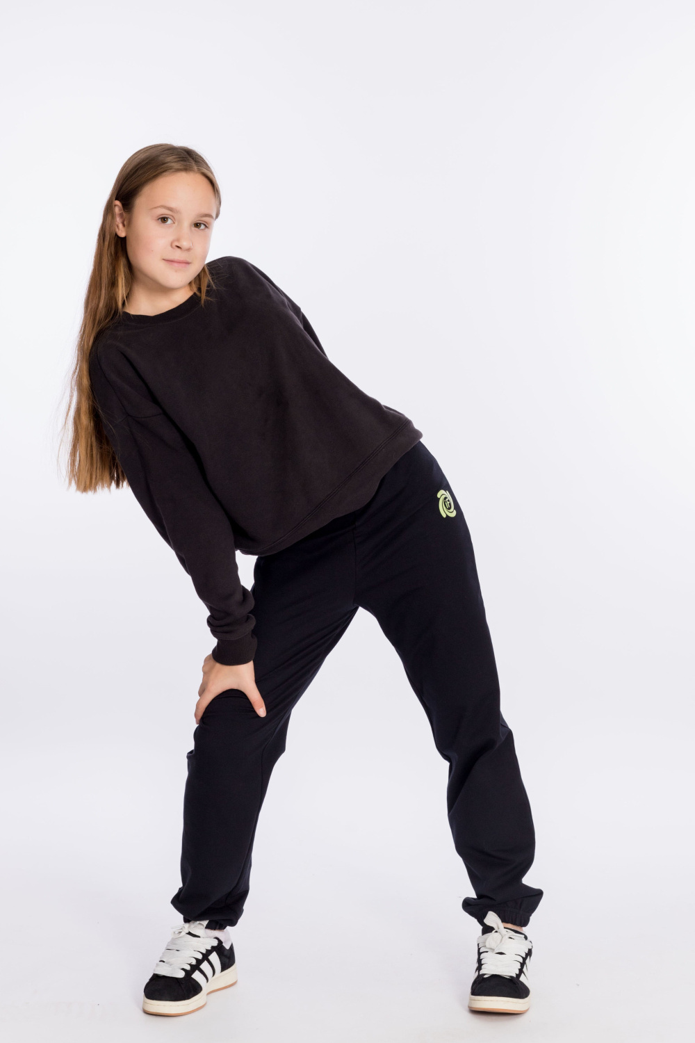 Брюки выполнены из однотонного футера с лайкрой. Пояс и низ брюк на резинке. В поясе через люверсы проложен декоративный шнур, с левой стороны на брюках нанесён термопринт.