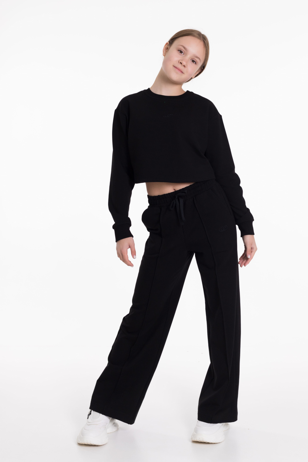 Брюки для девочки из футера 2х нитки черного цвета - стильный и удобный выбор. Свободный крой и пояс на резинке со шнуром обеспечат комфортную посадку и свободу движений. Наличие боковых карманов добавляет функциональности, позволяя хранить мелочи или просто удобно располагать руки.