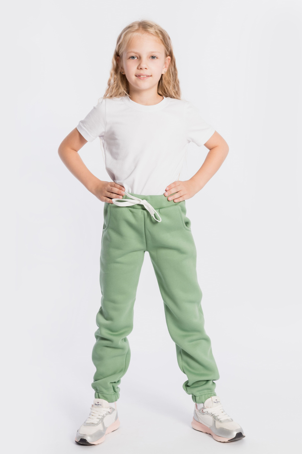 Тёплые, детские брюки выполнены из полотна с начёсом. По бокам расположены карманы, а для комфортной посадки в пояс вставлены шнур и резина. Низ брюк на резине.