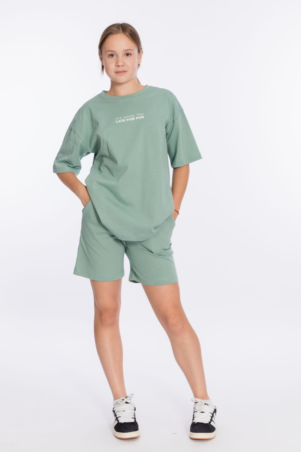 Футболка имеет короткий втачной рукав и украшена принтом спереди. Шорты слегка расширены, есть боковые карманы и притачной пояс на резинке. Костюм выполнен в однотонном цвете полынь, что позволяет сочетать его с различными элементами гардероба.