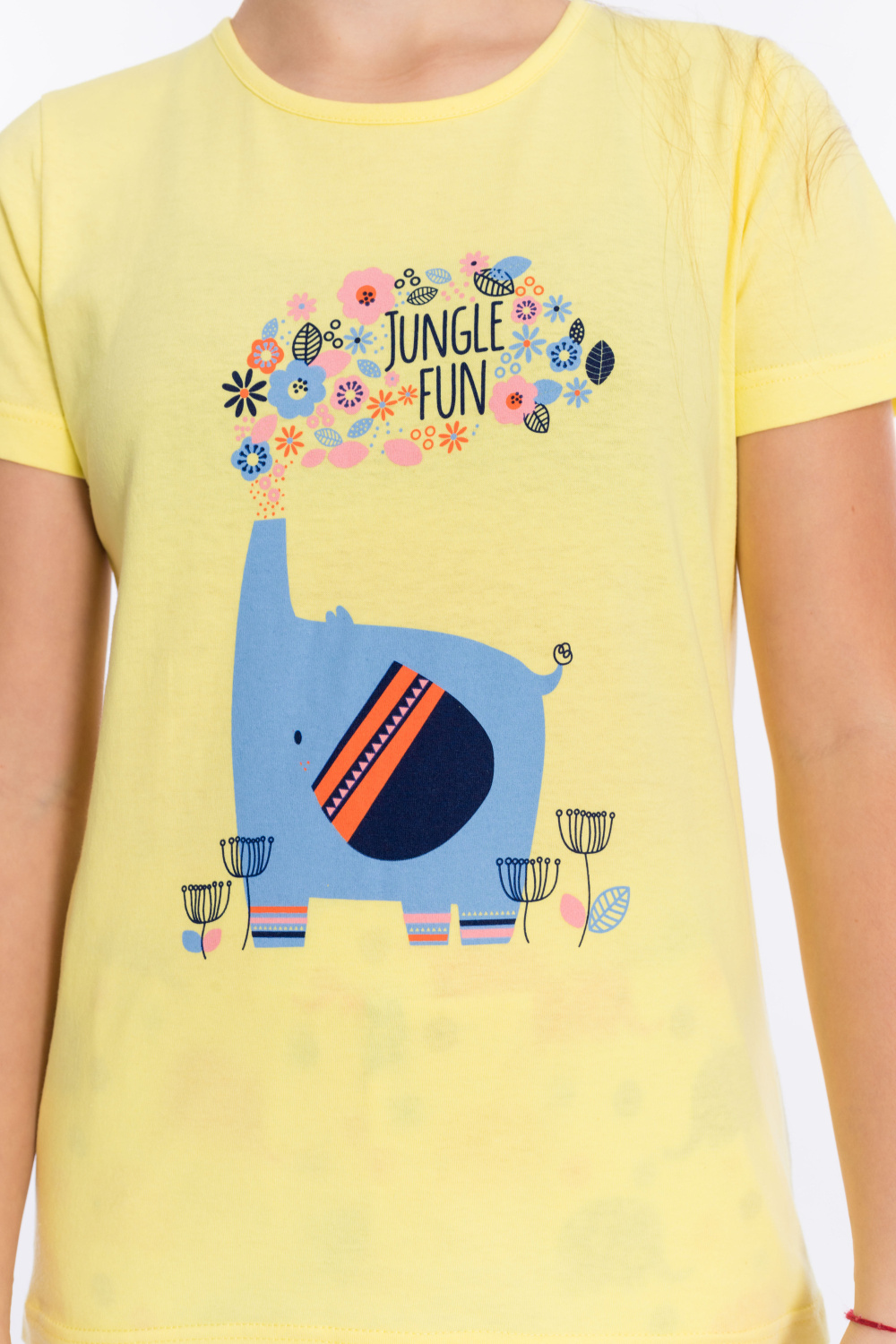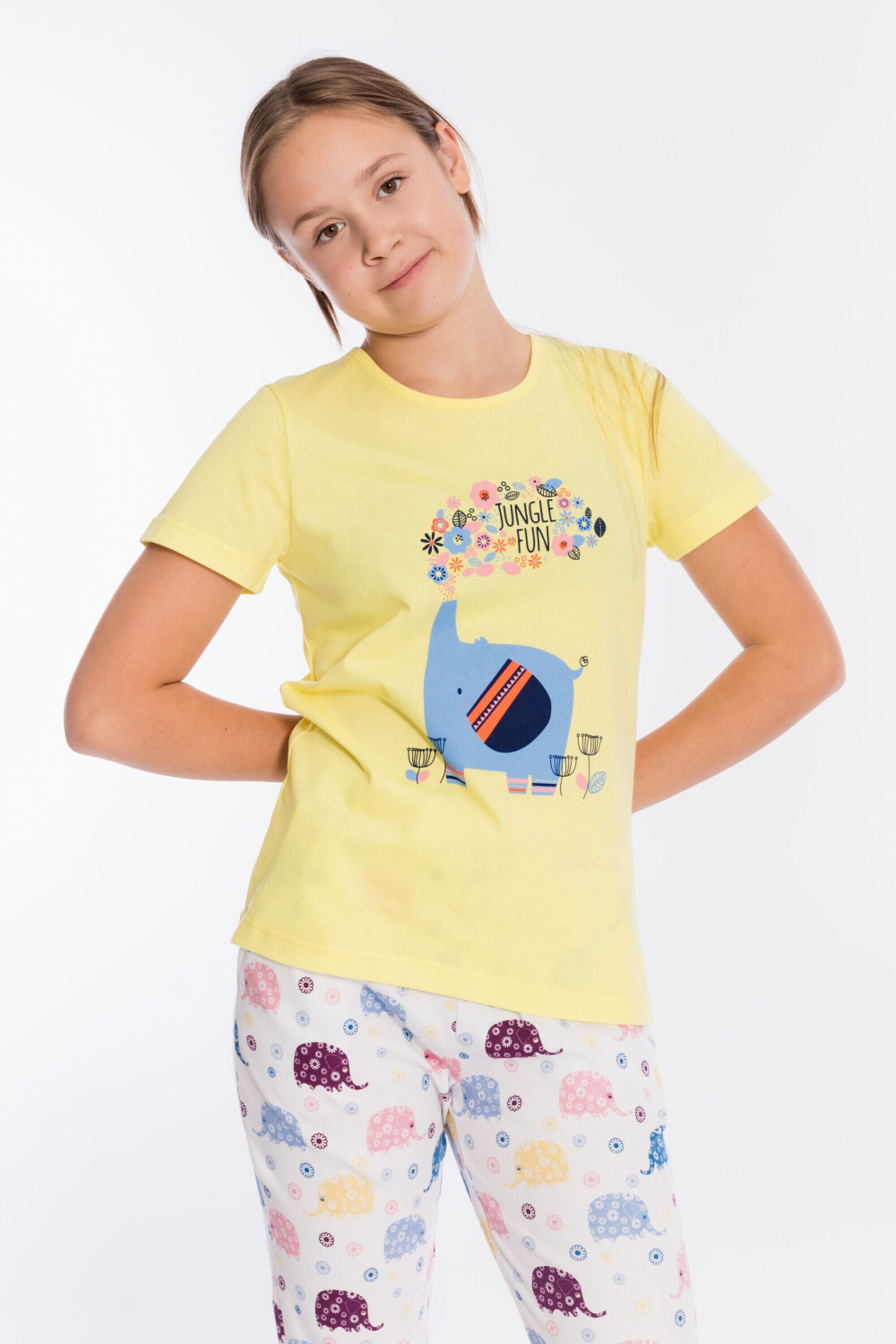 Костюм выполнен из хлопкового полотна, состоит из футболки и брюк. Футболка однотонная, с коротким рукавом, горловина с круглым вырезом обработана бейкой. Спереди расположен принт. Брюки из полотна с набивным рисунком, с боковыми карманами. Пояс и низ брюк на резинке.