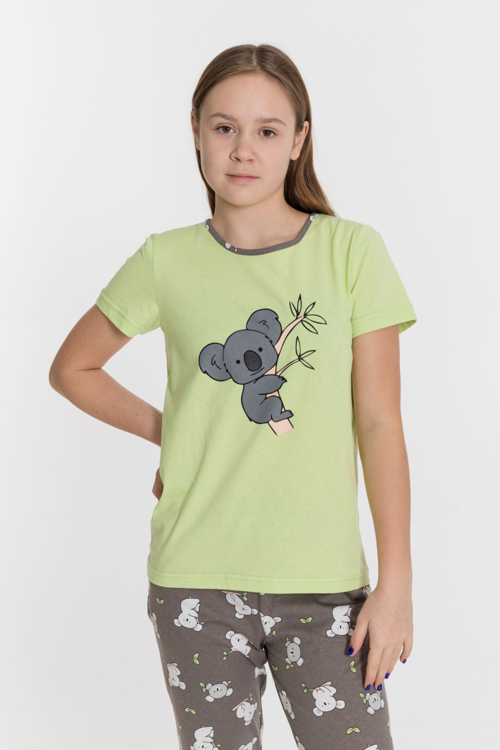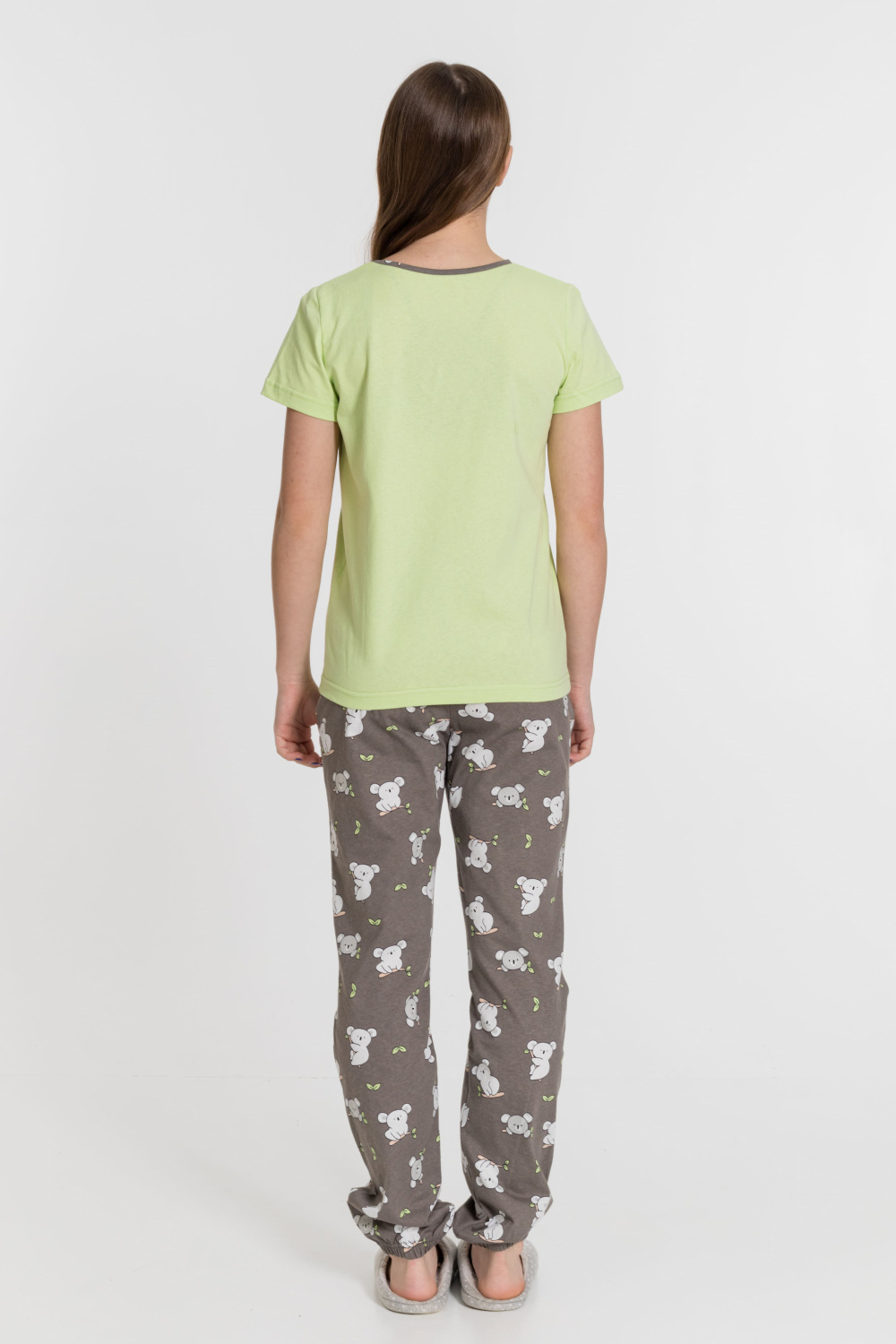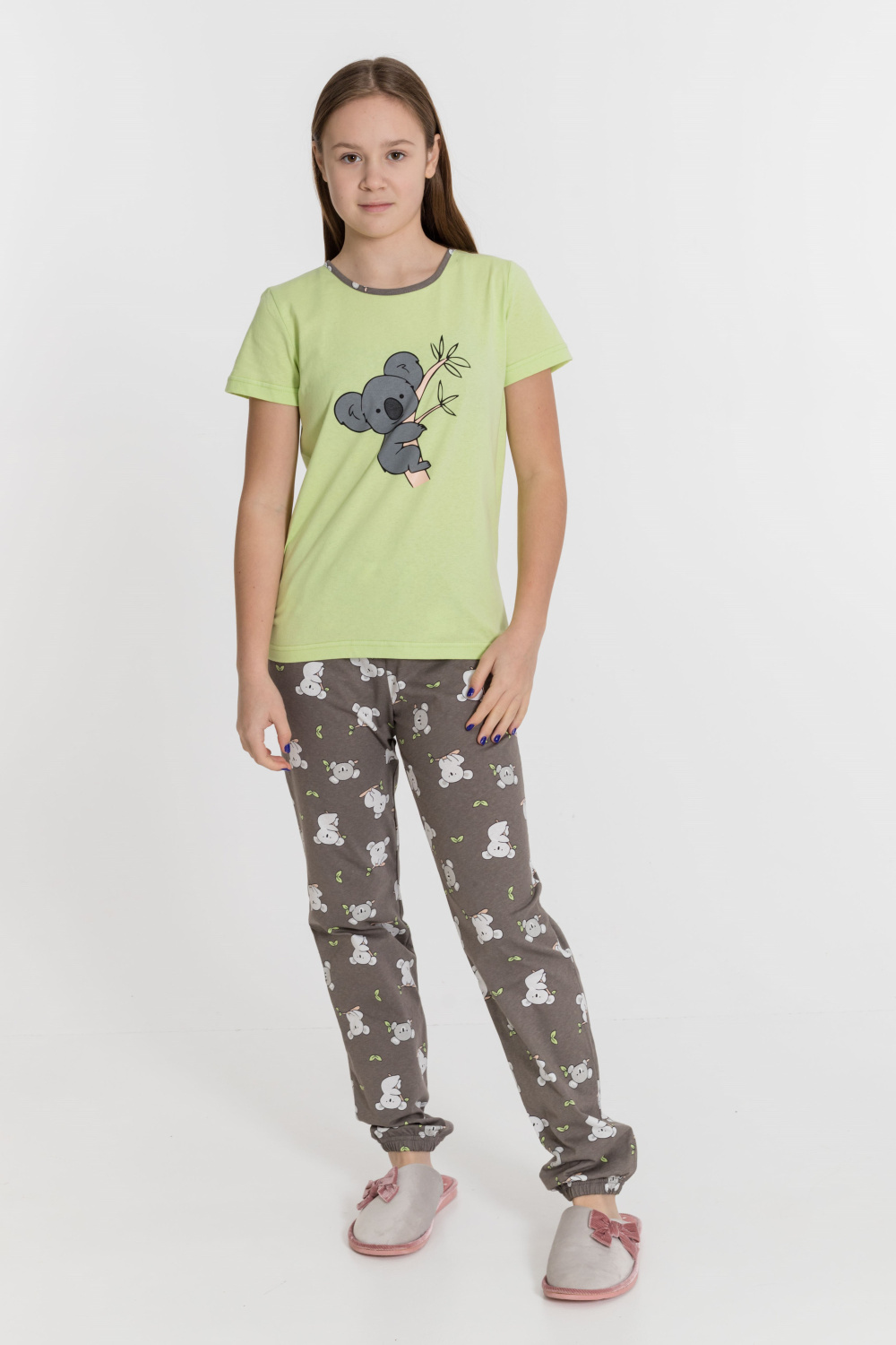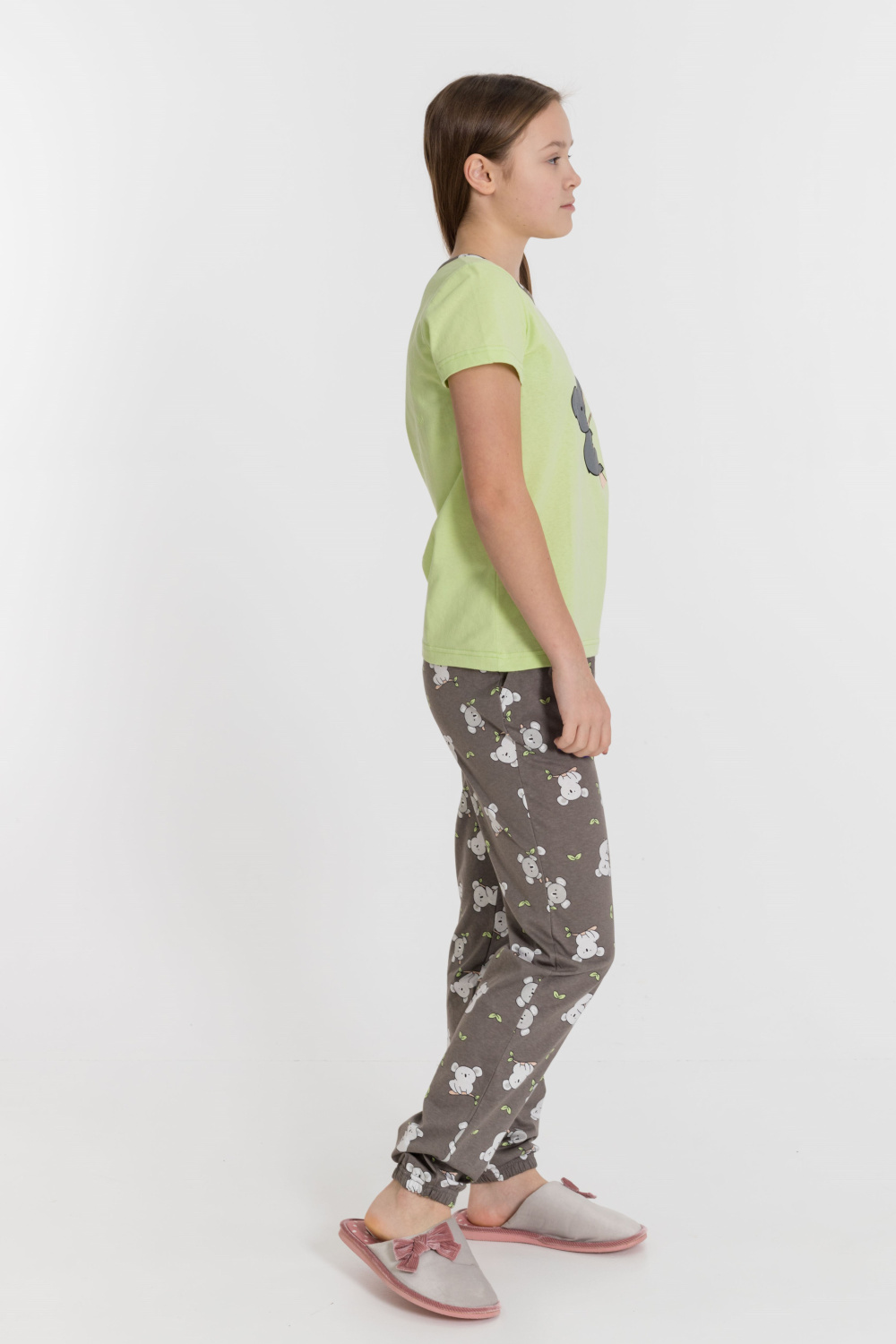 Костюм выполнен из 100% хлопкового полотна, состоит из футболки и брюк. Футболка с принтом спереди, горловина обработана бейкой. Брюки с карманами по бокам, низ слегка присборен резинкой.