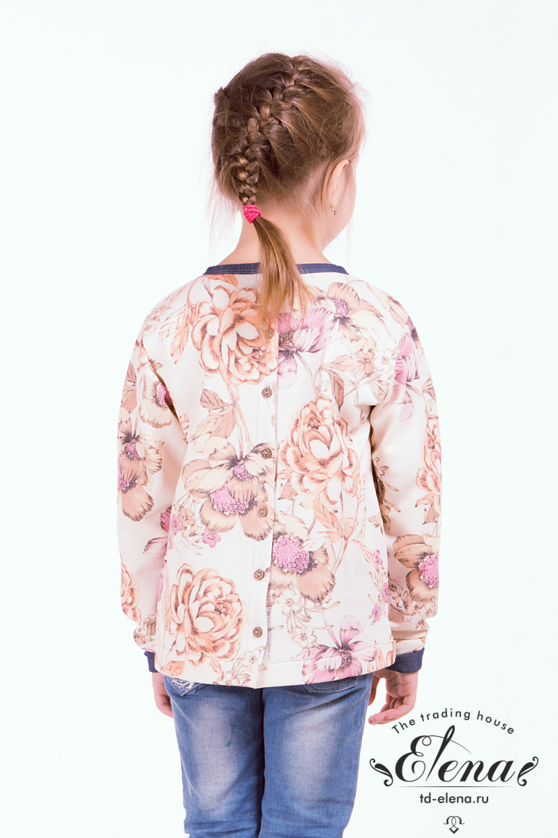 Джемпер выполнен из футер петли с набивным рисунком. Горловина, манжеты рукавов и нагрудный карман спереди из однотонного полотна. Сзади пуговицы по всей длине спинки.