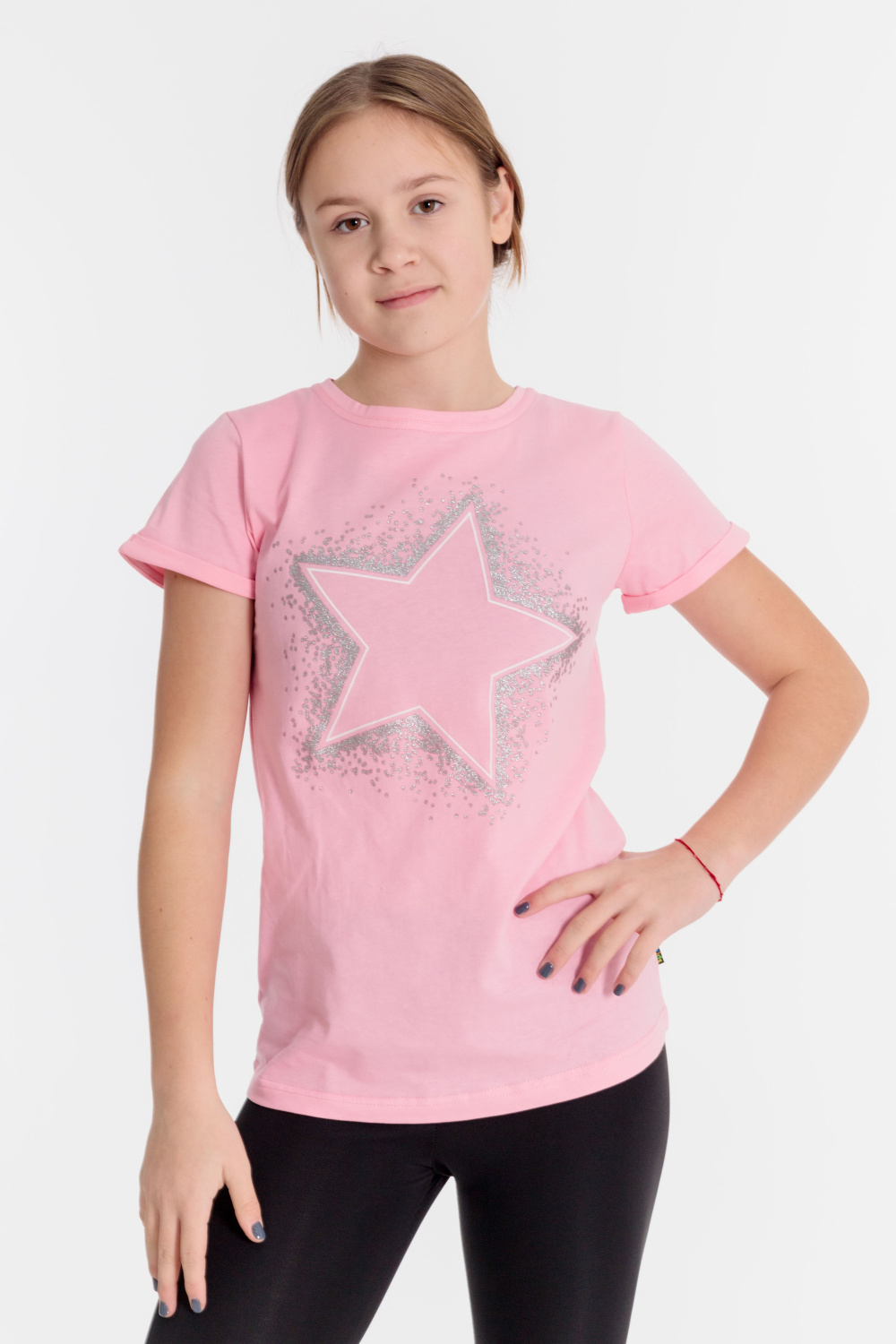 Футболка с принтом спереди выполнена из однотонной кулирки. Горловина округлая, обработана притачной планкой. Рукав короткий, втачной, с отложной манжетой.