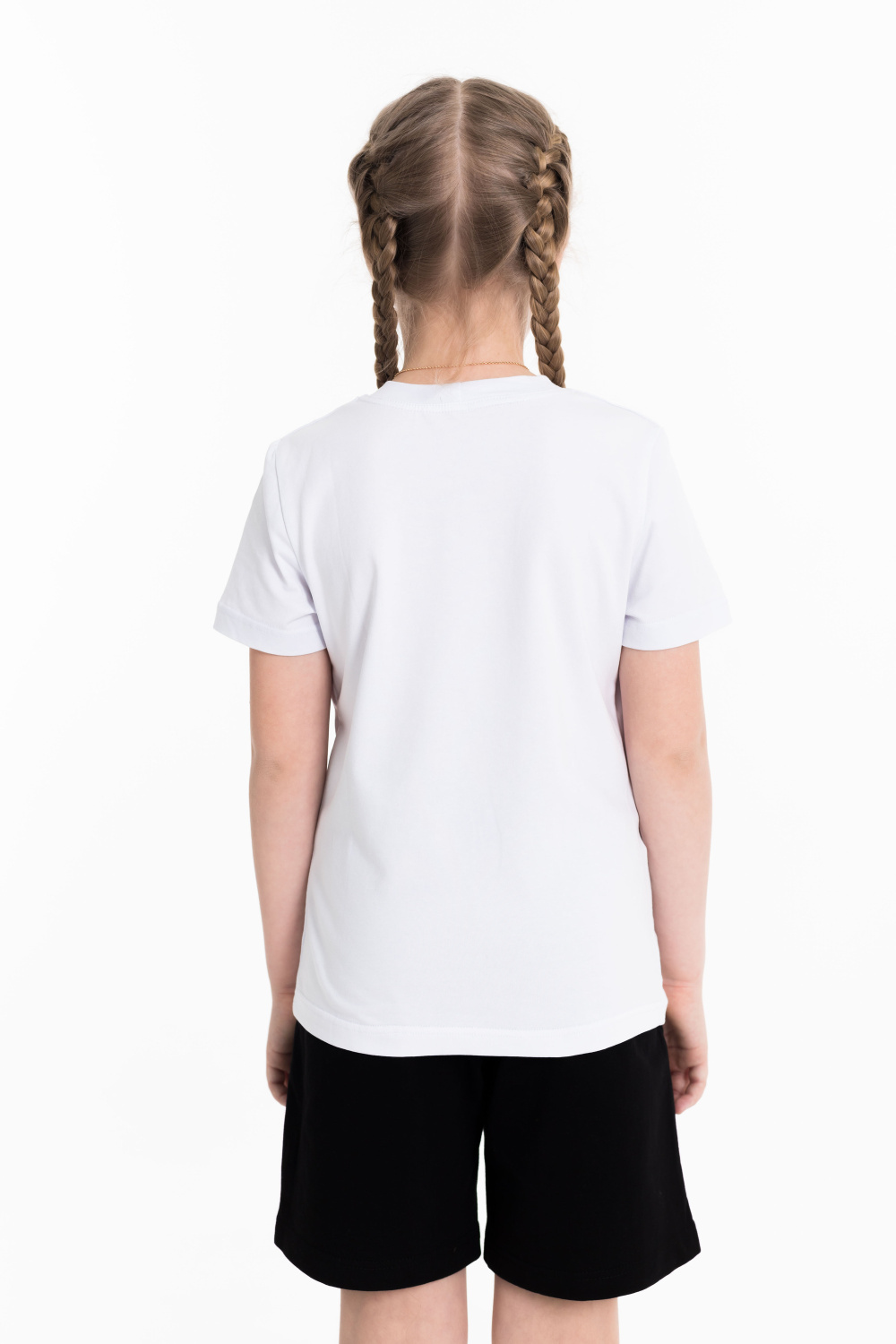 Футболка для девочки, выполнена из х/б полотна с лайкрой. Низ изделия и рукавов подшит эластичной строчкой. Силуэт приталенный. Горловина с круглым вырезом, обработана притачной планкой.