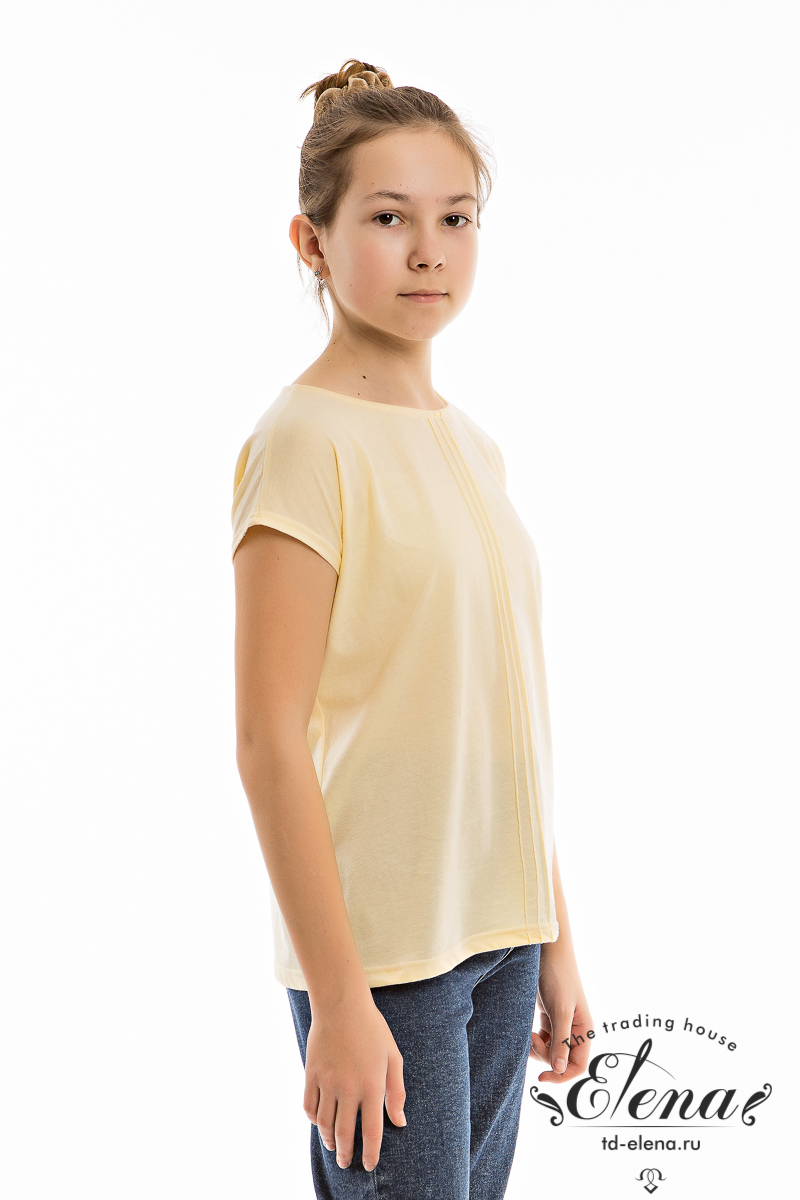 Футболка из однотонной кулирки, со спущенной линией плеча. Горловина с круглым вырезом, спереди по центру футболки три декоративных защипа.