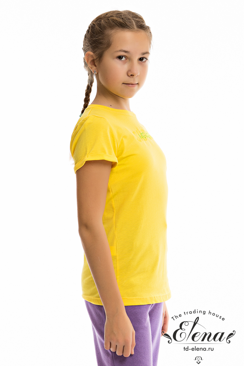 Футболка выполнена из однотонной кулирки. Вырез горловины округлый, обработан притачной планкой. Футболка с коротким втачным рукавом с отложной манжетой и красивой вышивкой спереди.