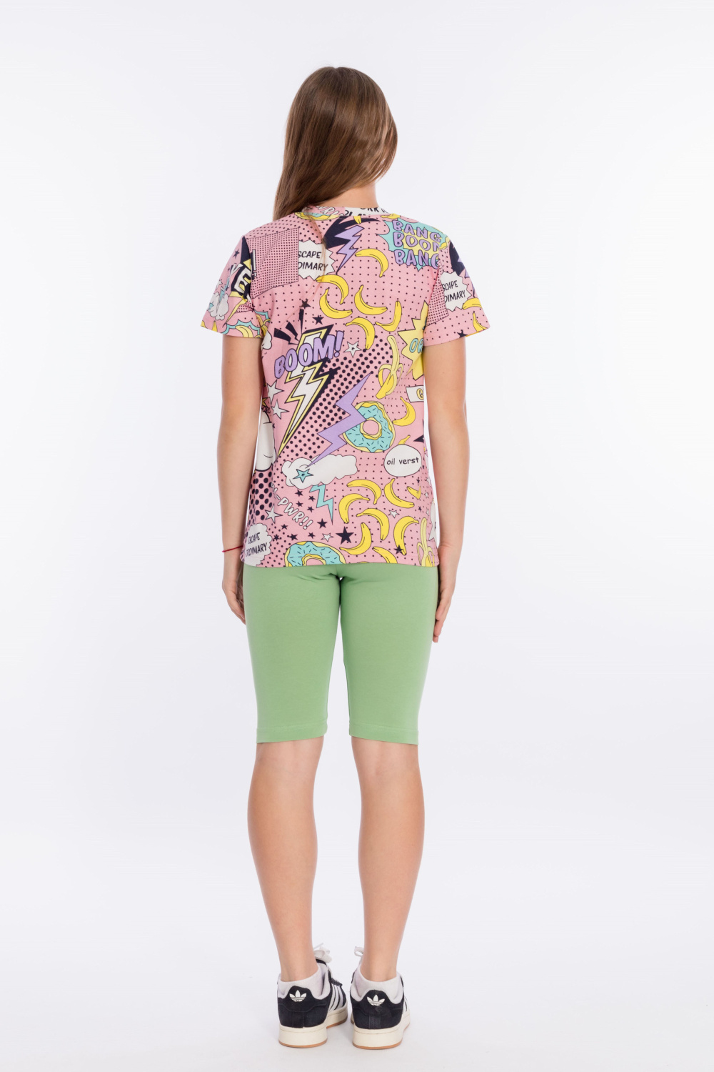 Футболка выполнена из кулирки с лайкрой. С коротким рукавом и круглым вырезом горловины.