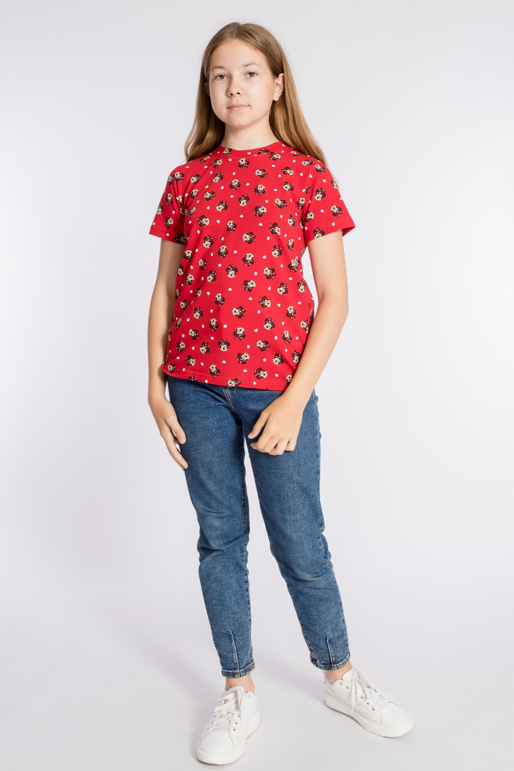 Футболка выполнена из кулирки с лайкрой. С коротким рукавом и круглым вырезом горловины.