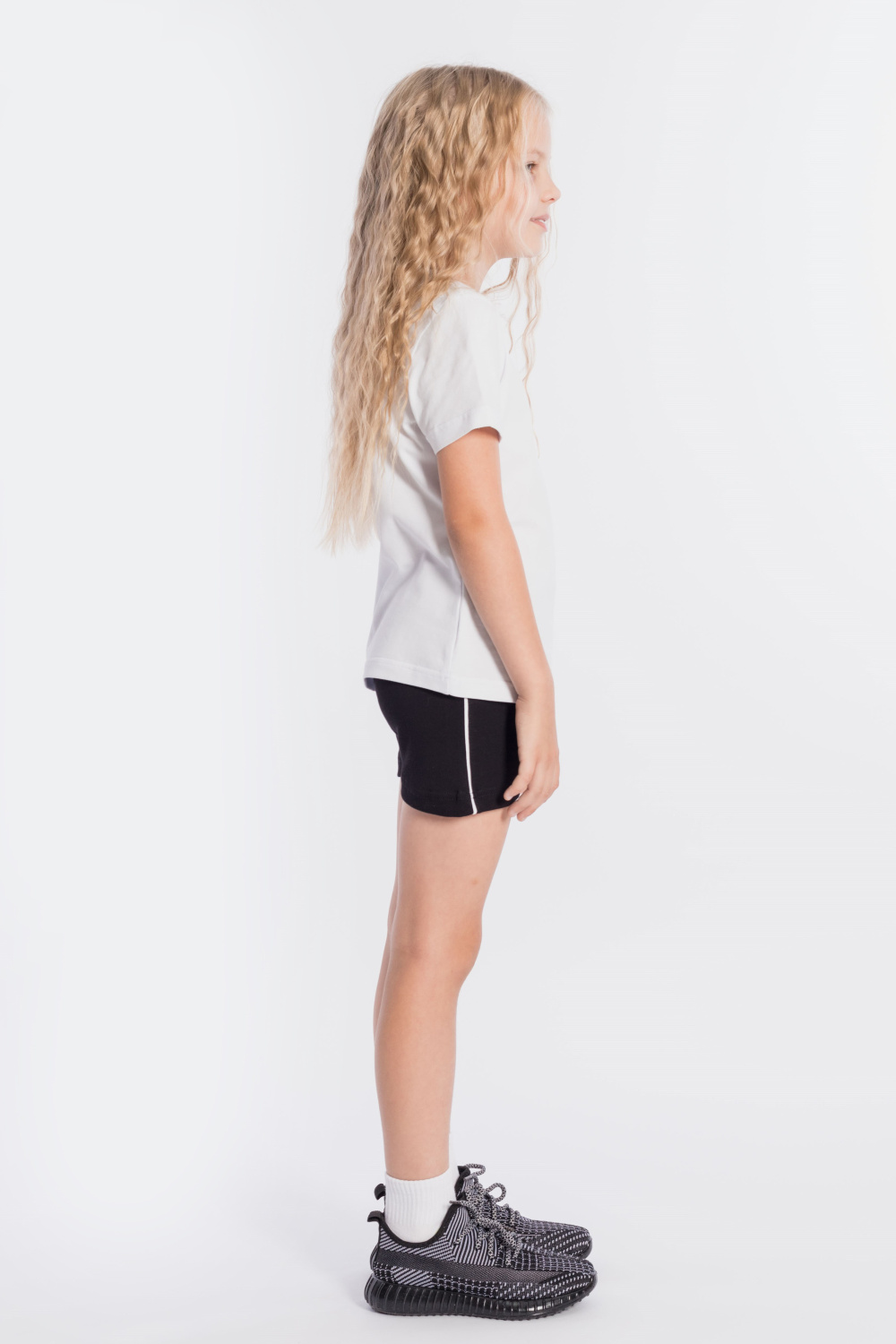 Футболка выполнена из хлопкового полотна, с коротким рукавом и круглым вырезом горловины.