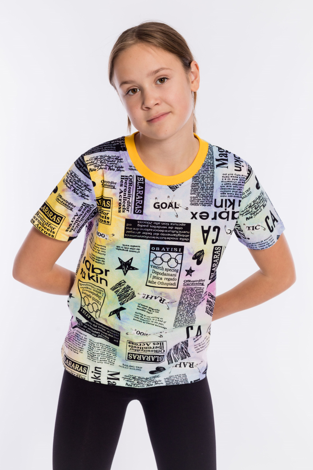 Футболка выполнена из хлопкового полотна c набивным рисунком, с коротким рукавом и круглым вырезом горловины.