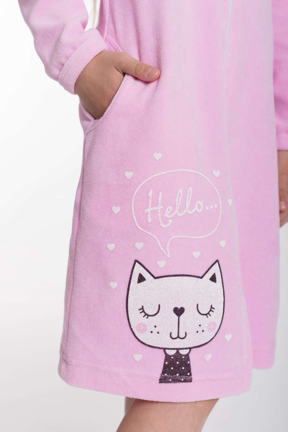 Халат с длинными рукавами выполнен из велюра. Центральная застёжка на молнию, по бокам расположены два кармана. Спереди на халате нанесён принт.