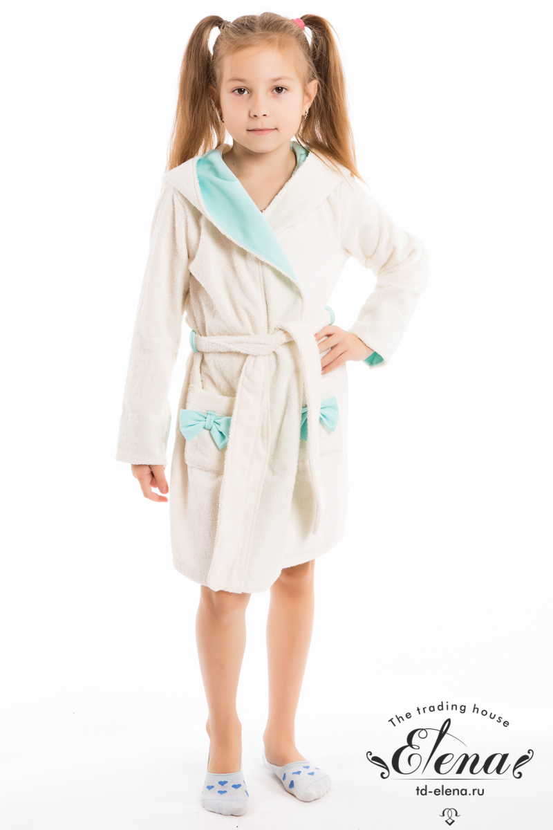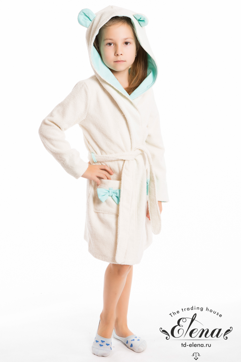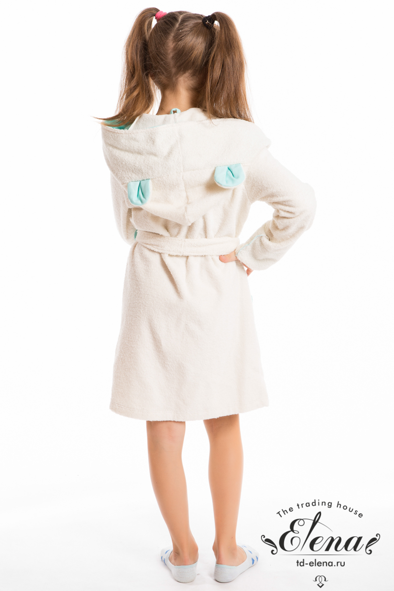 Халат из махрового х/б полотна в сочетании с интерлоком. Халат на запах, с длинным рукавом и поясом. По бокам расположены два накладных кармана, украшенных бантиками. Капюшон декорирован "ушками". В ростке спинки для удобства пришита петелька.