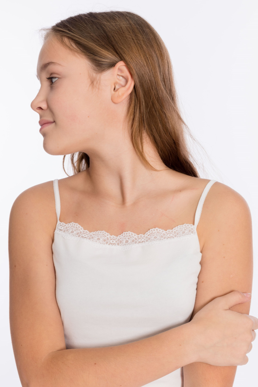 Комплект выполнен из хлопкового полотна с добавлением лайкры. Топ на тонких бретелях, с кружевной вставкой. Трусы с отделочной резиной.