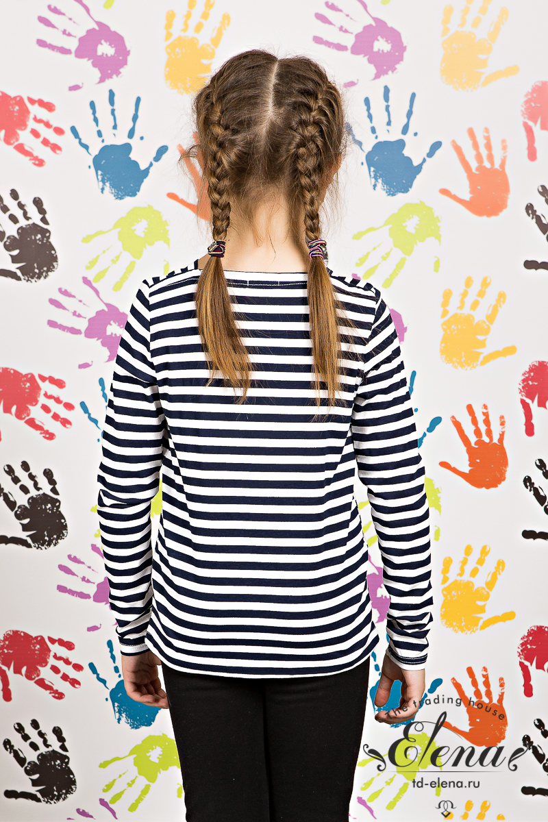 Тельняшка с длинным рукавом для девочки выполнена из кулирки. Горловина каре за счет плечевых вставок. Спереди сделана аппликация.