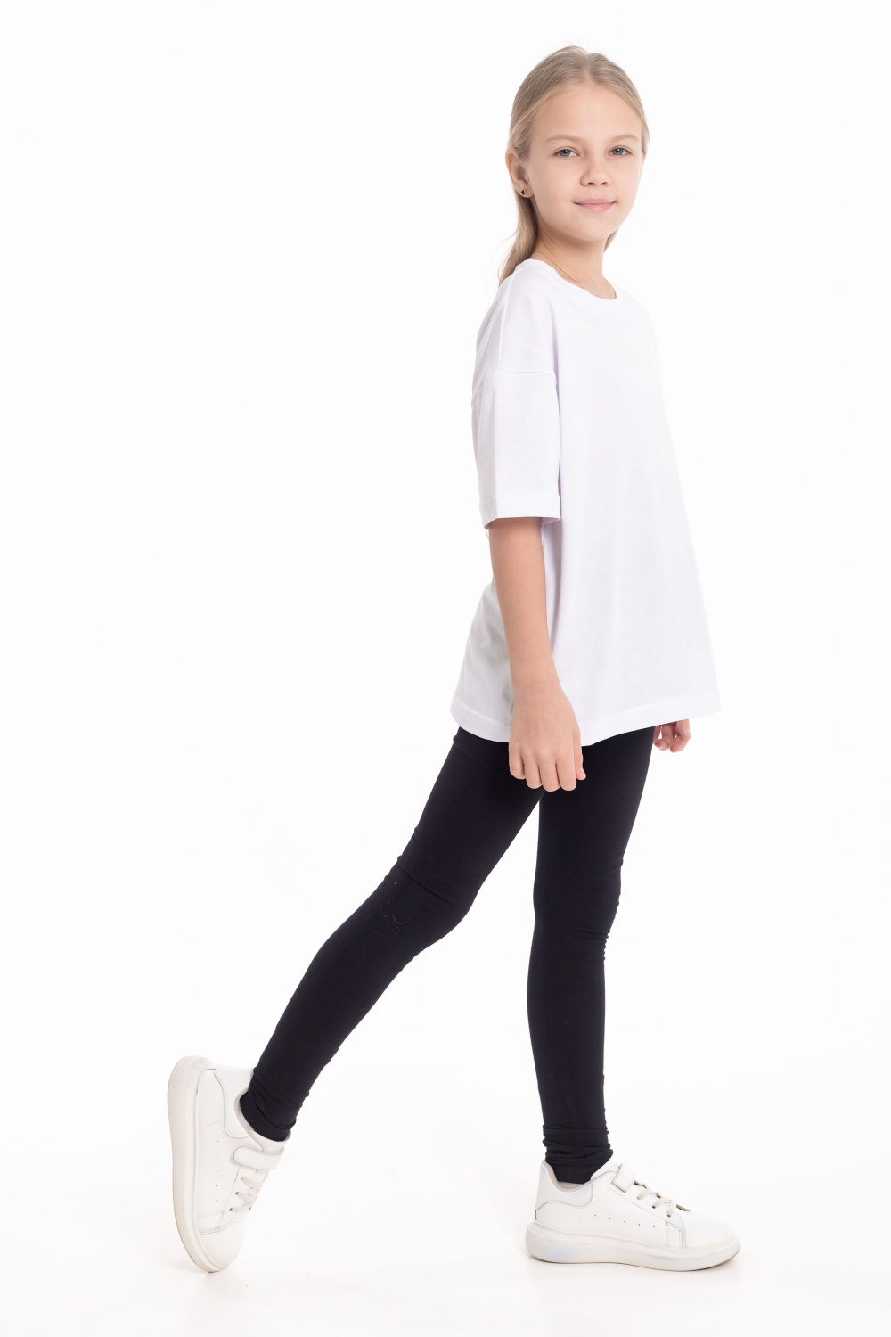 Лосины для девочки выполнены из хлопкового полотна с добавлением лайкры. Пояс на резинке.