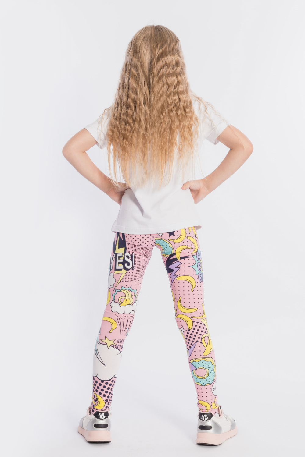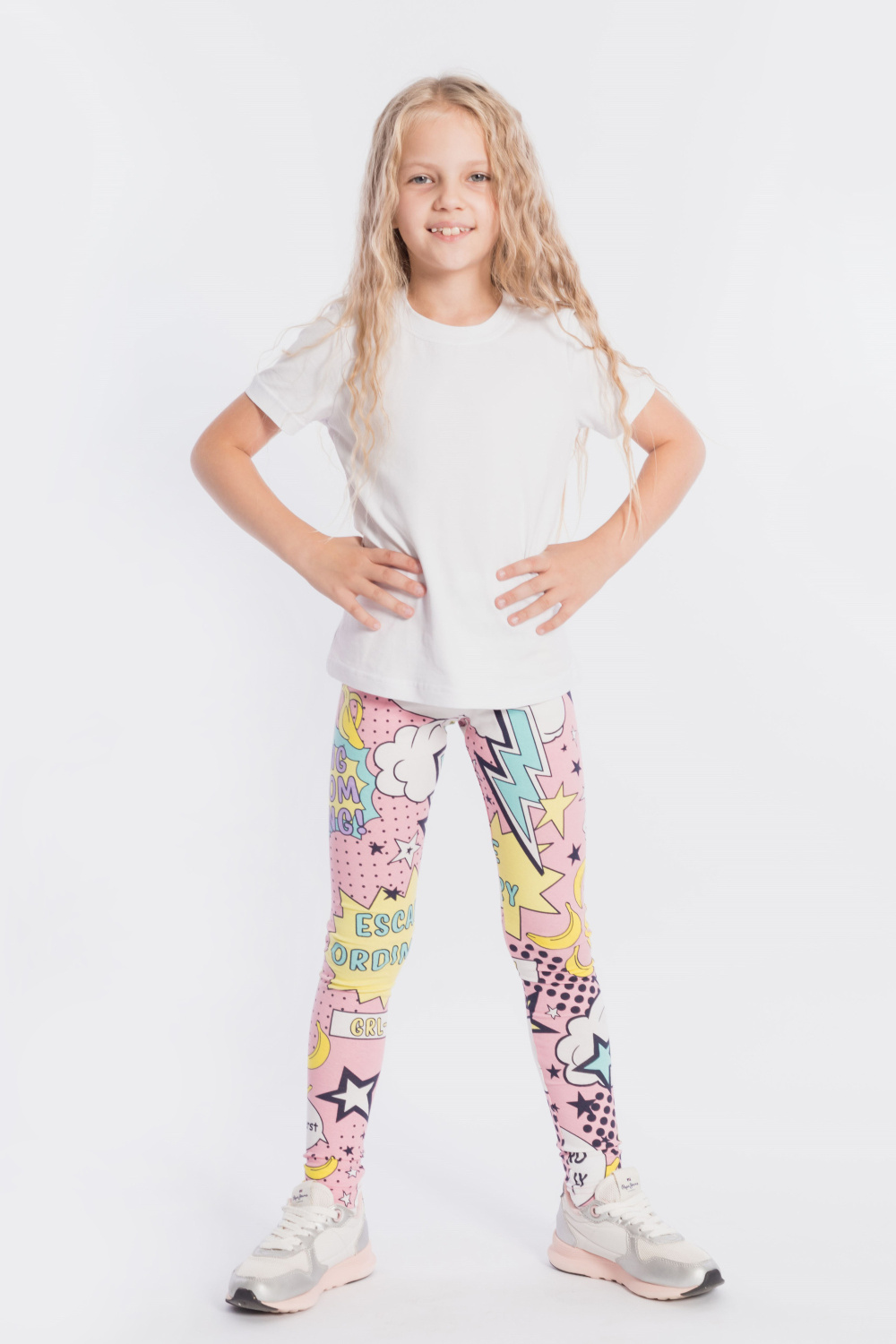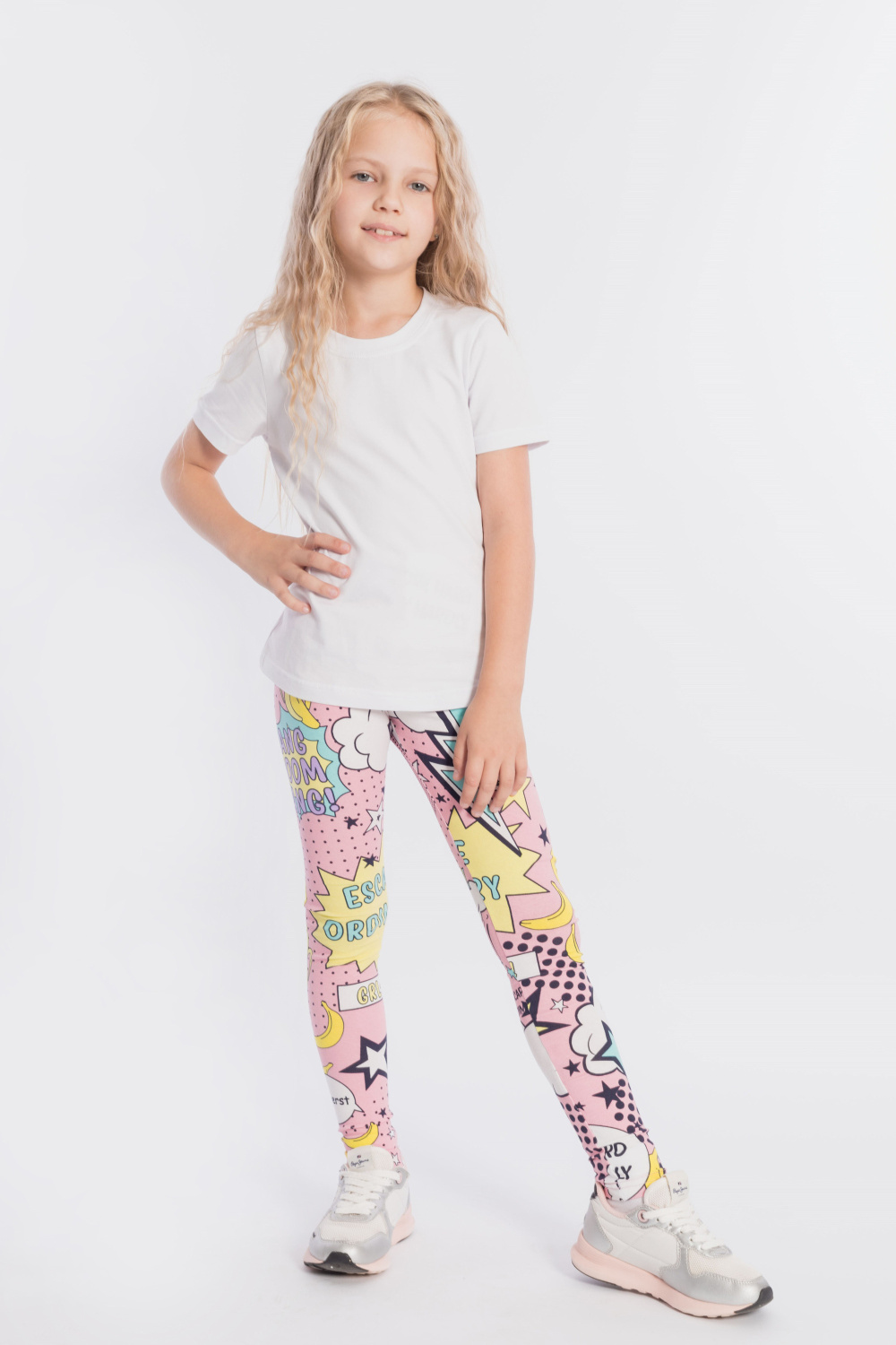Лосины для девочки выполнены из хлопкового полотна с добавлением лайкры. Пояс на резинке.