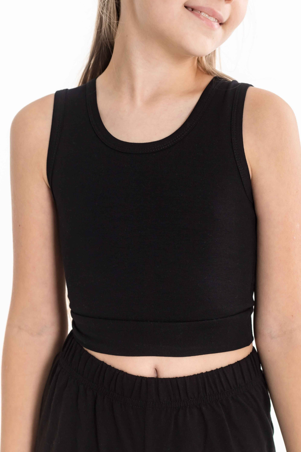 Майка укороченная из однотонной кулирки с лайкрой, горловина и проймы обработаны бейкой.