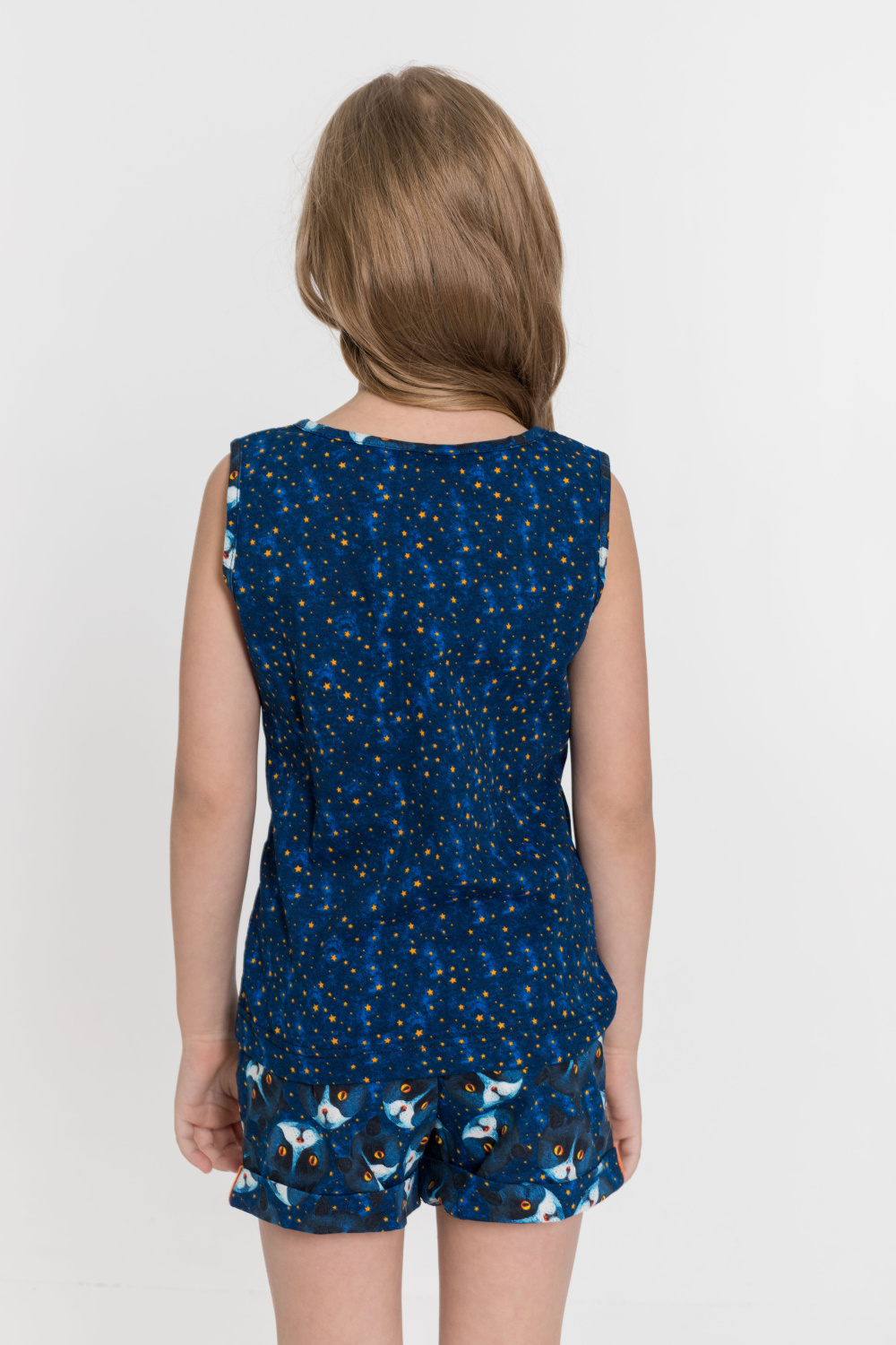 Комплект из х/б полотна. На круглой горловине майки декоративный вырез в форме галки, отделанный репсовой лентой. Шорты с поясом на резине и карманами по бокам. Низ шорт оформлен отворотами.