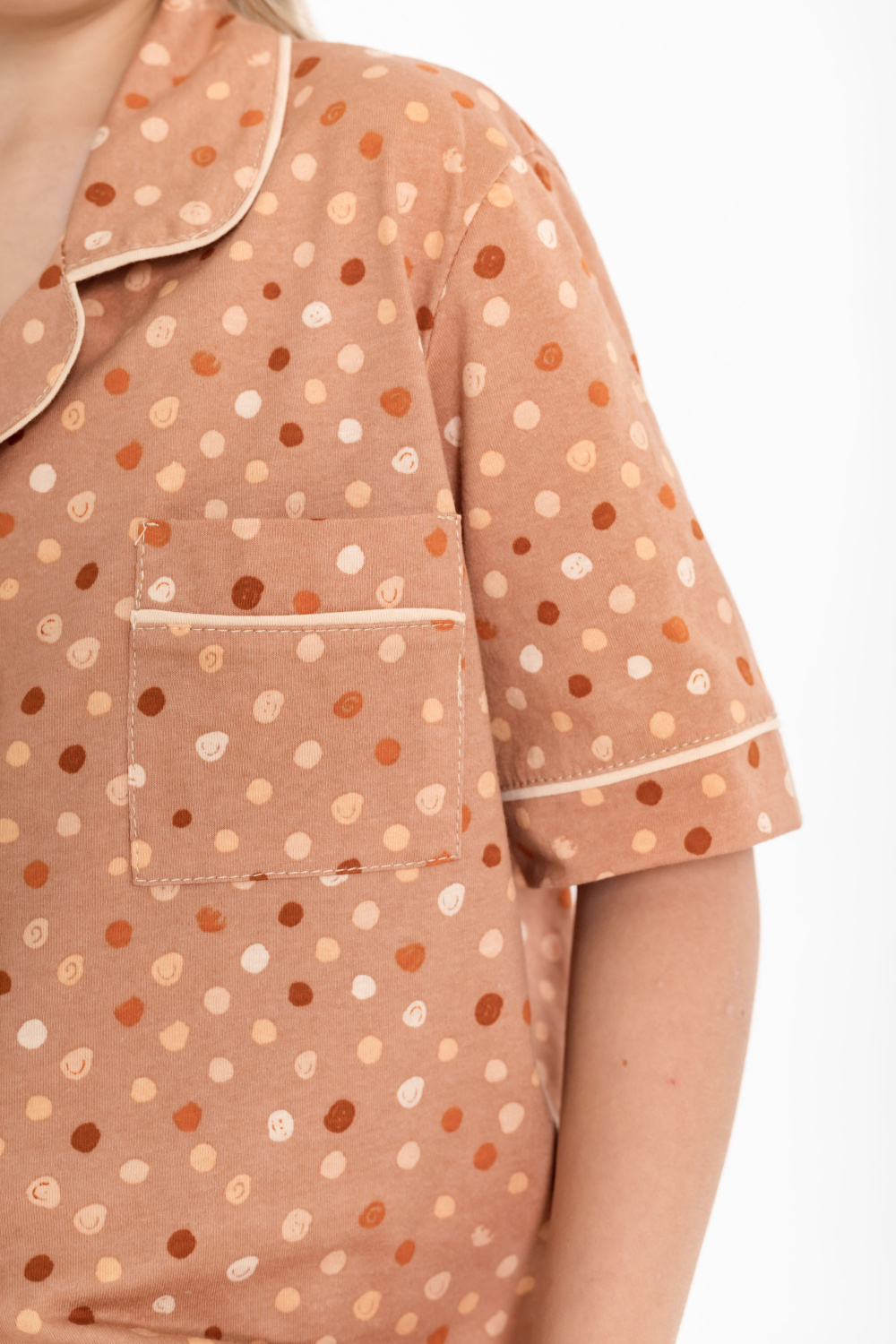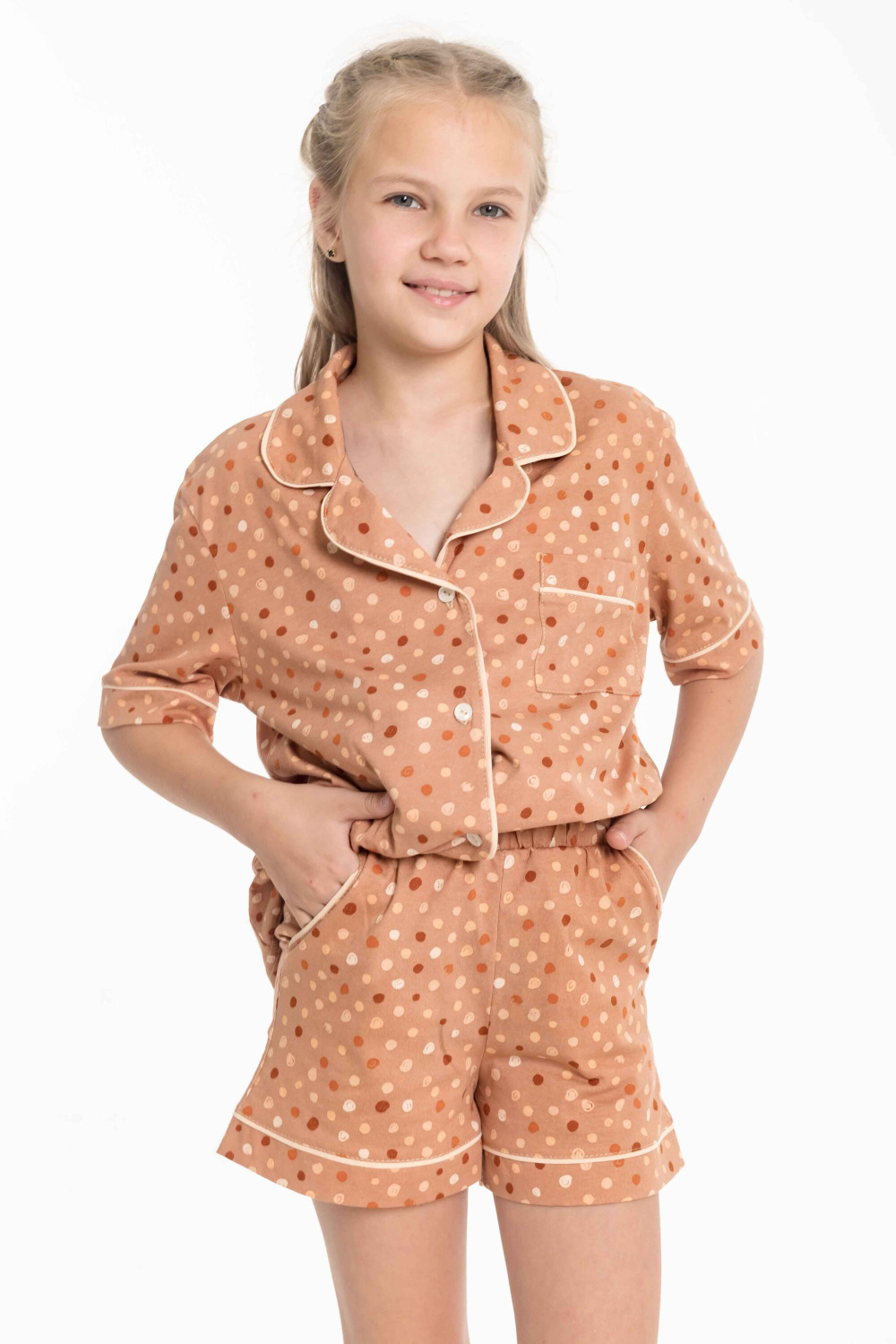 Пижама для девочки выполнена из мягкой кулирки. Рубашка с коротким рукавом, воротником и застежкой на пуговицы. На полочке расположен нагрудный карман, все детали оформлены кантом из отделочного полотна. Шорты свободного кроя с поясом на резинке, также декорированы кантом. Модель удобна в носке и идеально подходит для сна и отдыха.