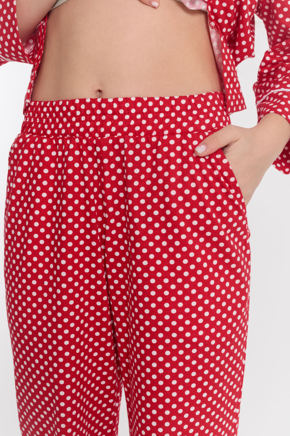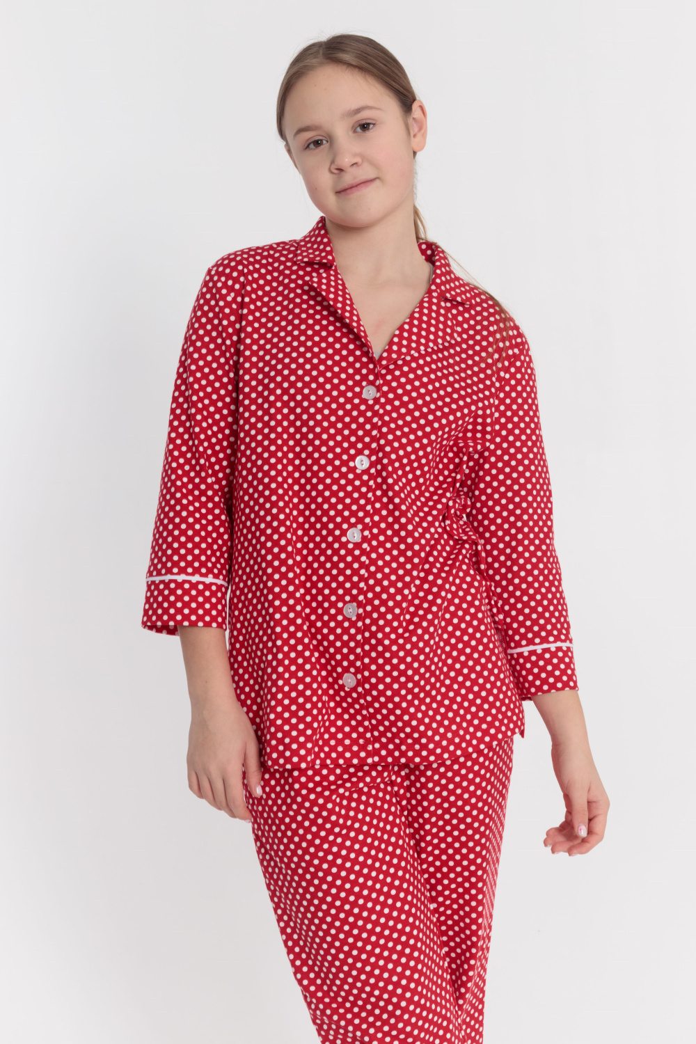 Пижама выполнена из кулирки с набивкой в горошек с отделкой кантом на рубашке и брюках. Рубашка с отложным воротником и бортами, с рукавом длиной 3/4 и разрезами в боковых швах. Спереди застёжка на пуговицы. Брюки с боковыми карманами и притачным поясом.