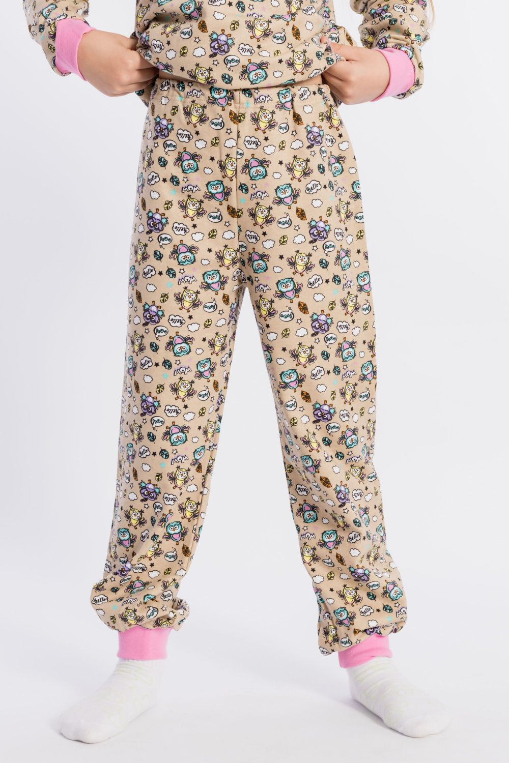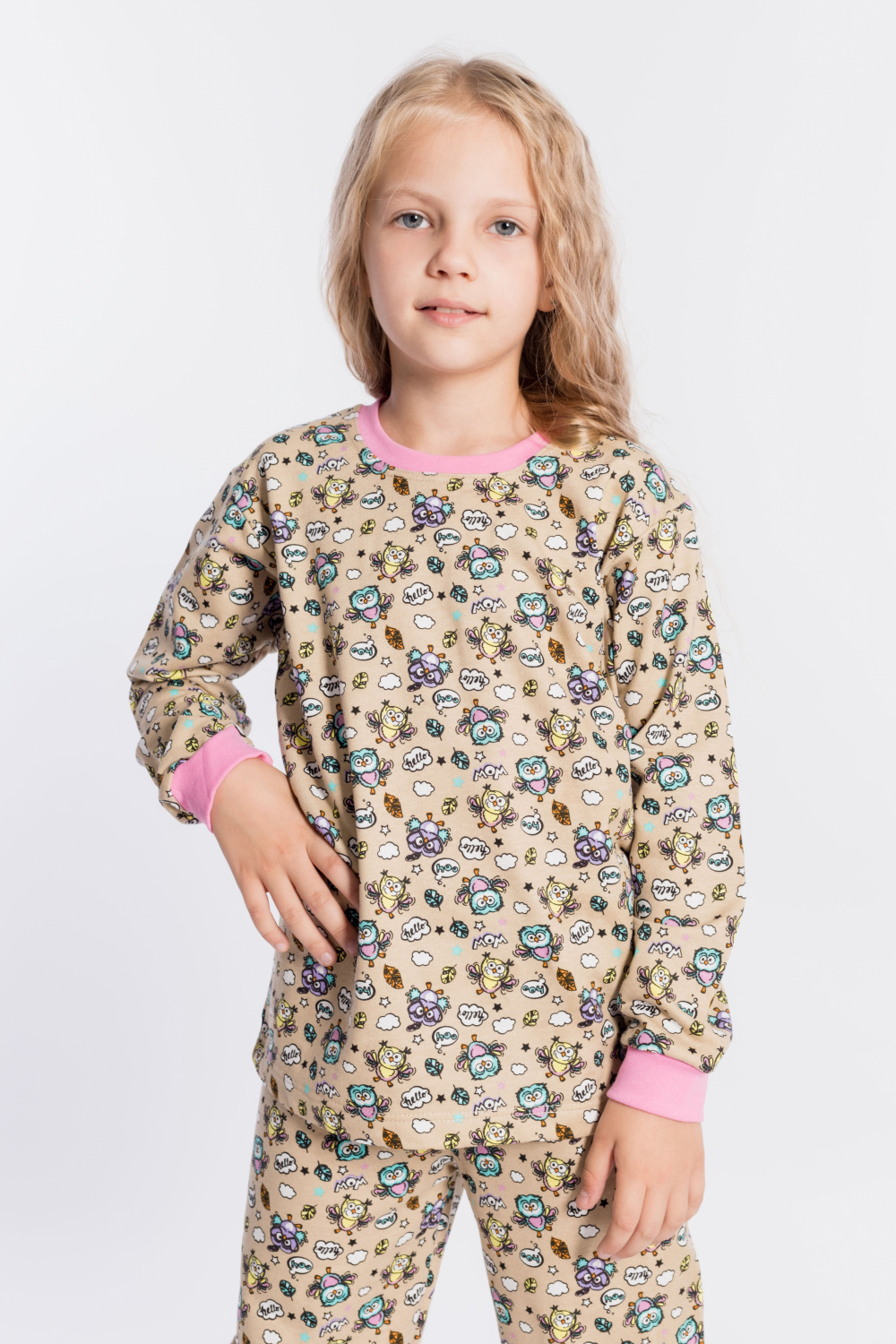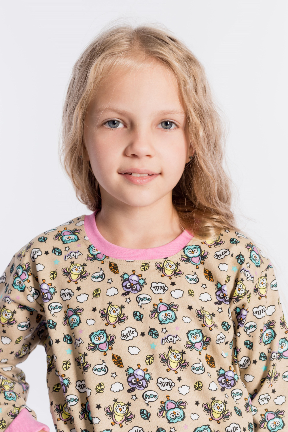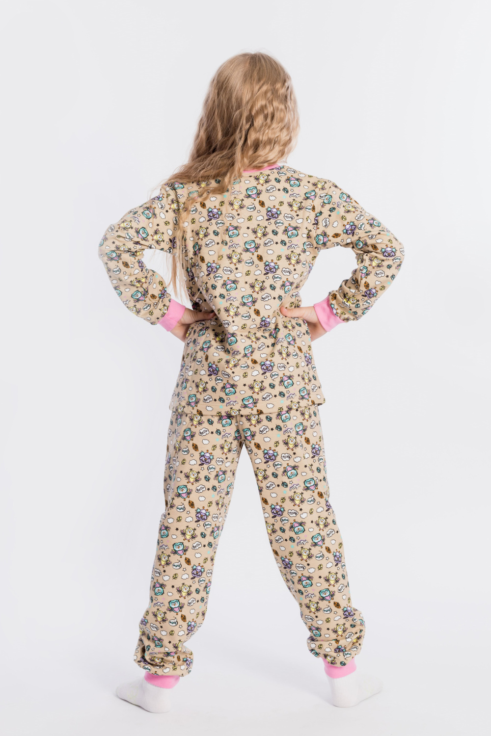 Пижама выполнена из хлопковой ткани с начёсом. Футболка с длинным рукавом и круглым вырезом горловины. Брюки прямого покроя на резине по поясу.