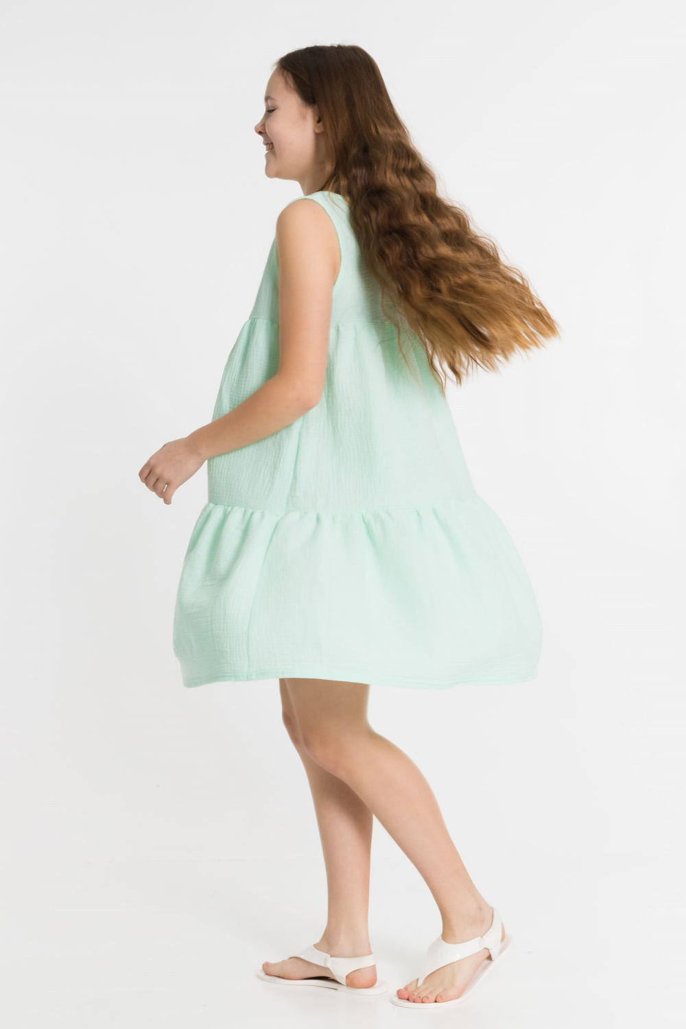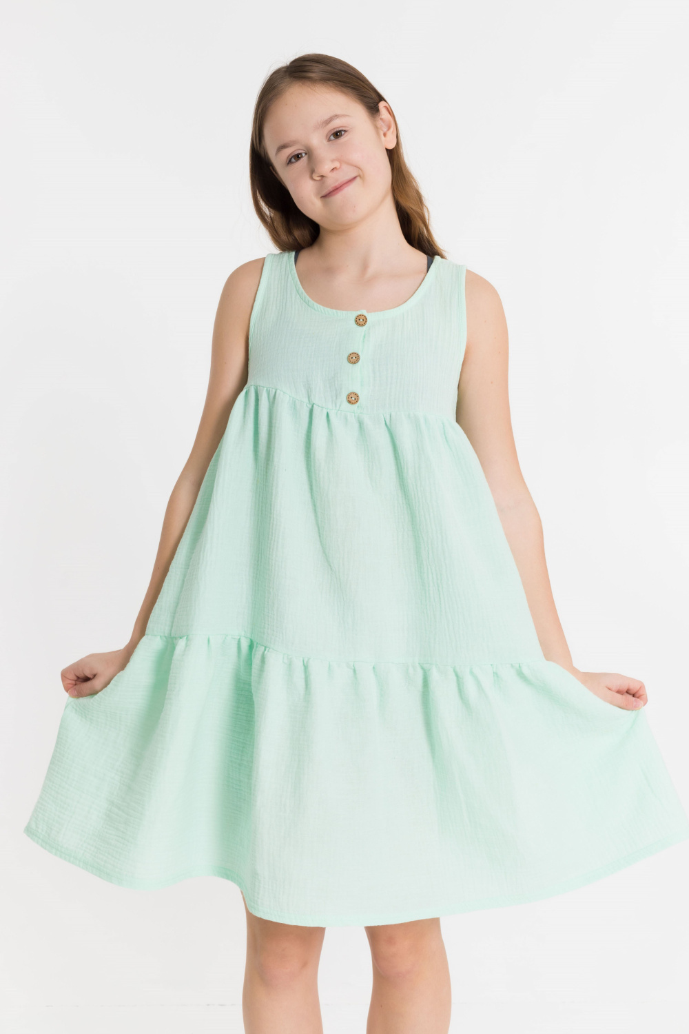 Сарафан для девочки выполнен из муслина. Пройма и горловина обработаны бейкой, спереди, на кокетках, оформлена ложная застежка.