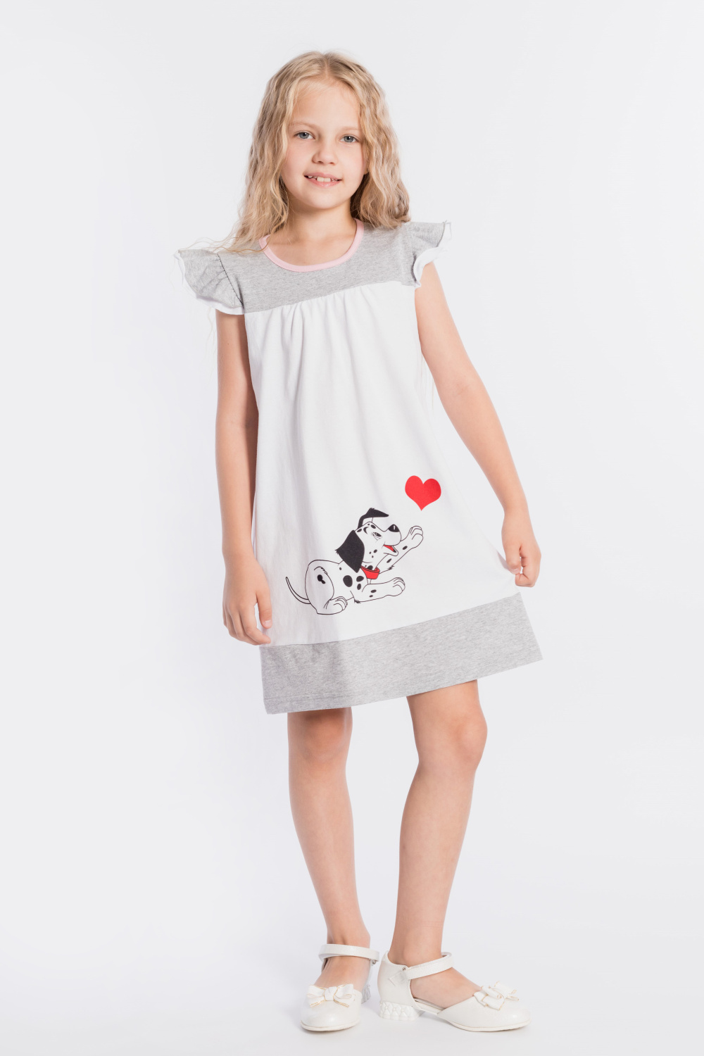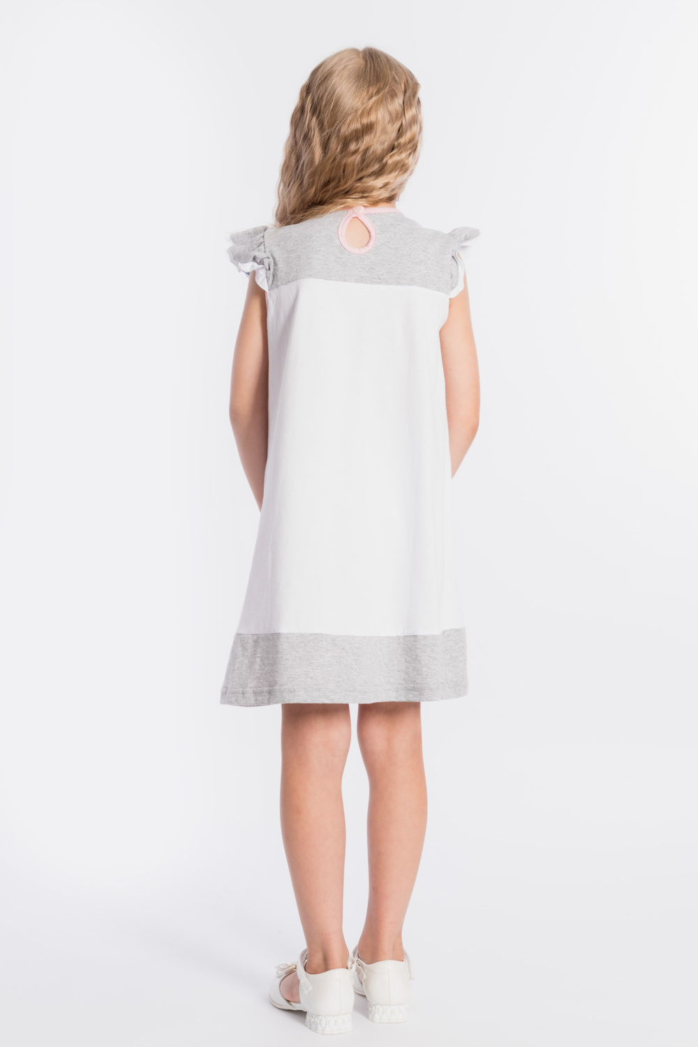 Платье выполнено из хлопкового полотна двух цветов. Спереди нанесен красивый принт. Двойные крылышки так же являются украшением платья, горловина и проймы обработаны бейкой. Сзади декоративный вырез и застёжка на пуговицу.