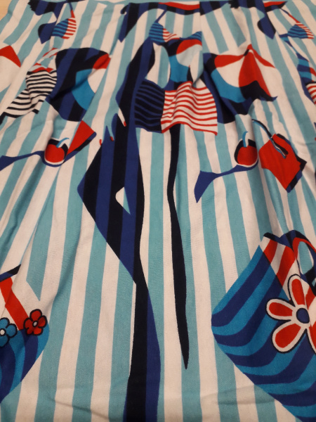 Сарафан с кулиской по талии выполнен из кулирки с набивным рисунком, 100% хлопок. Спереди планка с застёжкой на пуговицы, с левой стороны декоративный клапан. Горловина и проймы обработаны широкой бейкой. Низ разноуровневый, спинка длиннее переда.
