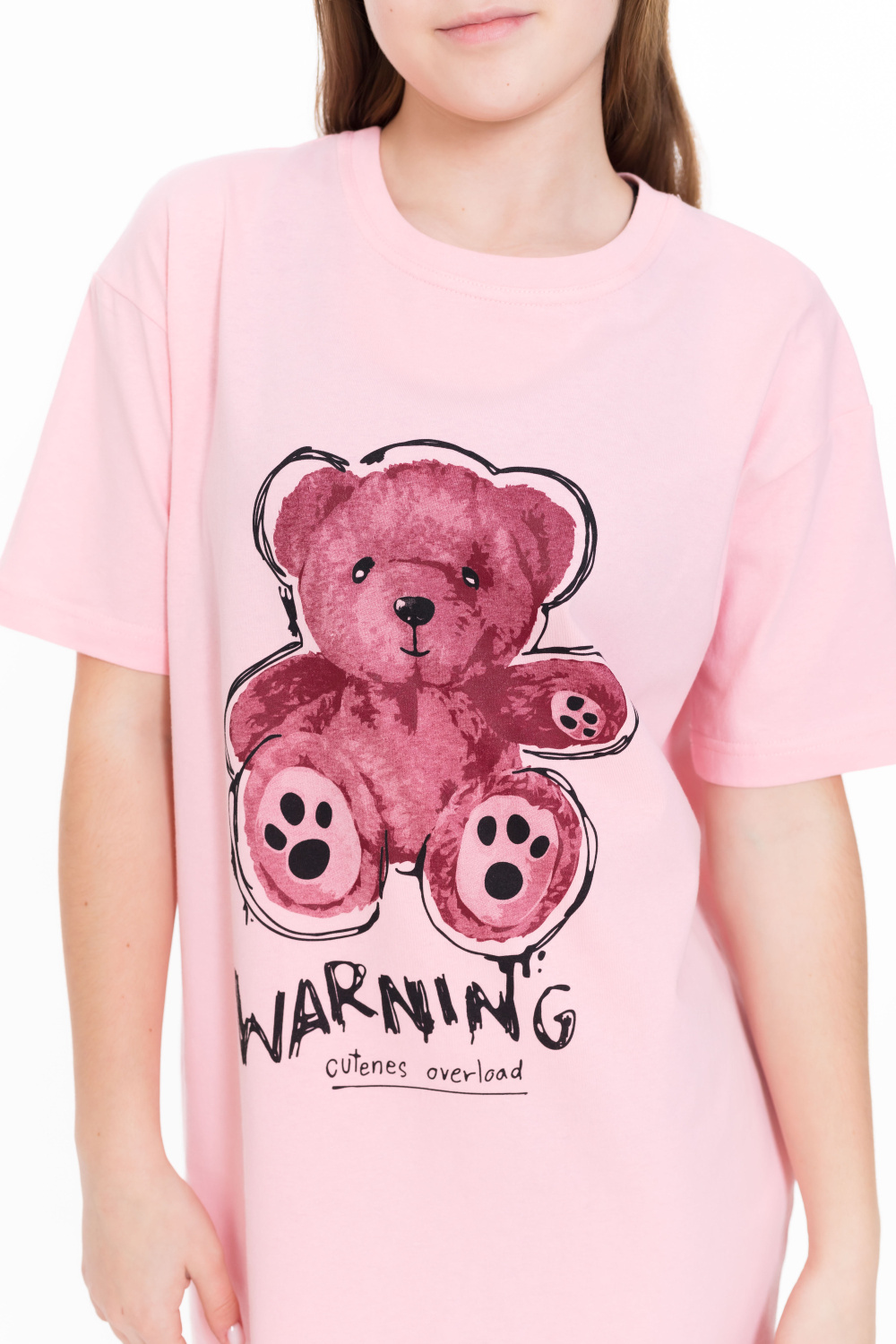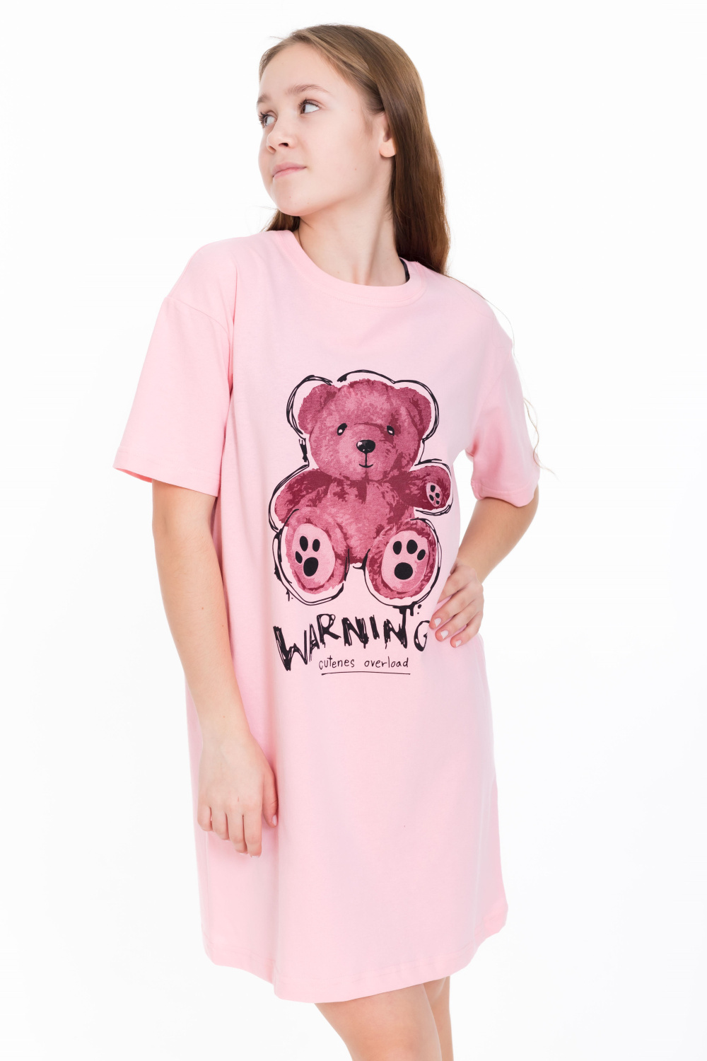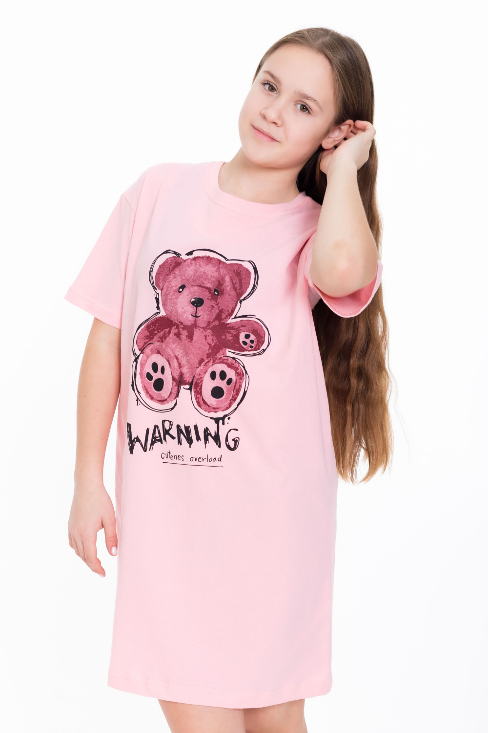 Сорочка-футболка для девочки из однотонной кулирки розового цвета очаровательна и уютна. Прямой крой с коротким рукавом и круглым вырезом горловины делают ее комфортной и практичной в использовании. Принт на передней части добавляет игривости и оригинальности к изделию, придавая индивидуальность.