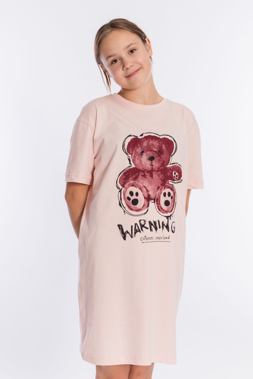 Сорочка-футболка выполнена из однотонной кулирки. С коротким рукавом и принтом спереди. Круглый вырез горловины оформлен планкой.