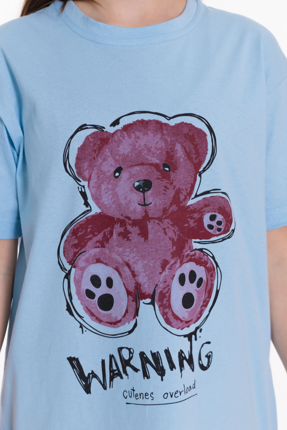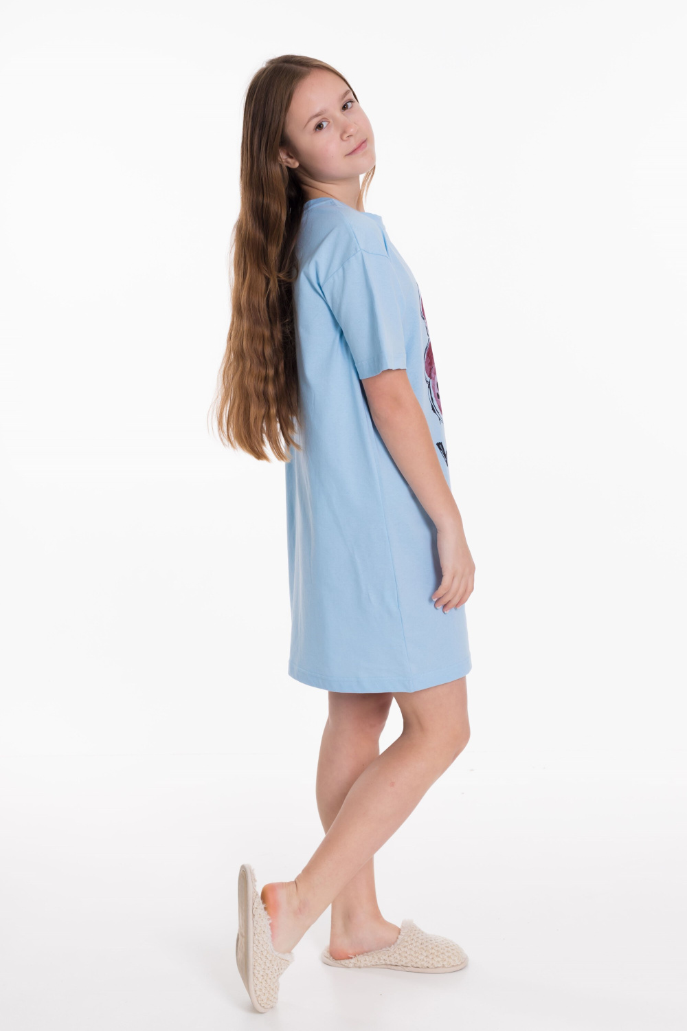Сорочка-футболка выполнена из однотонной кулирки. С коротким рукавом и принтом спереди. Круглый вырез горловины оформлен планкой.