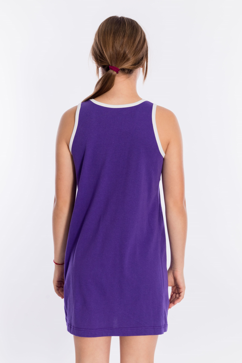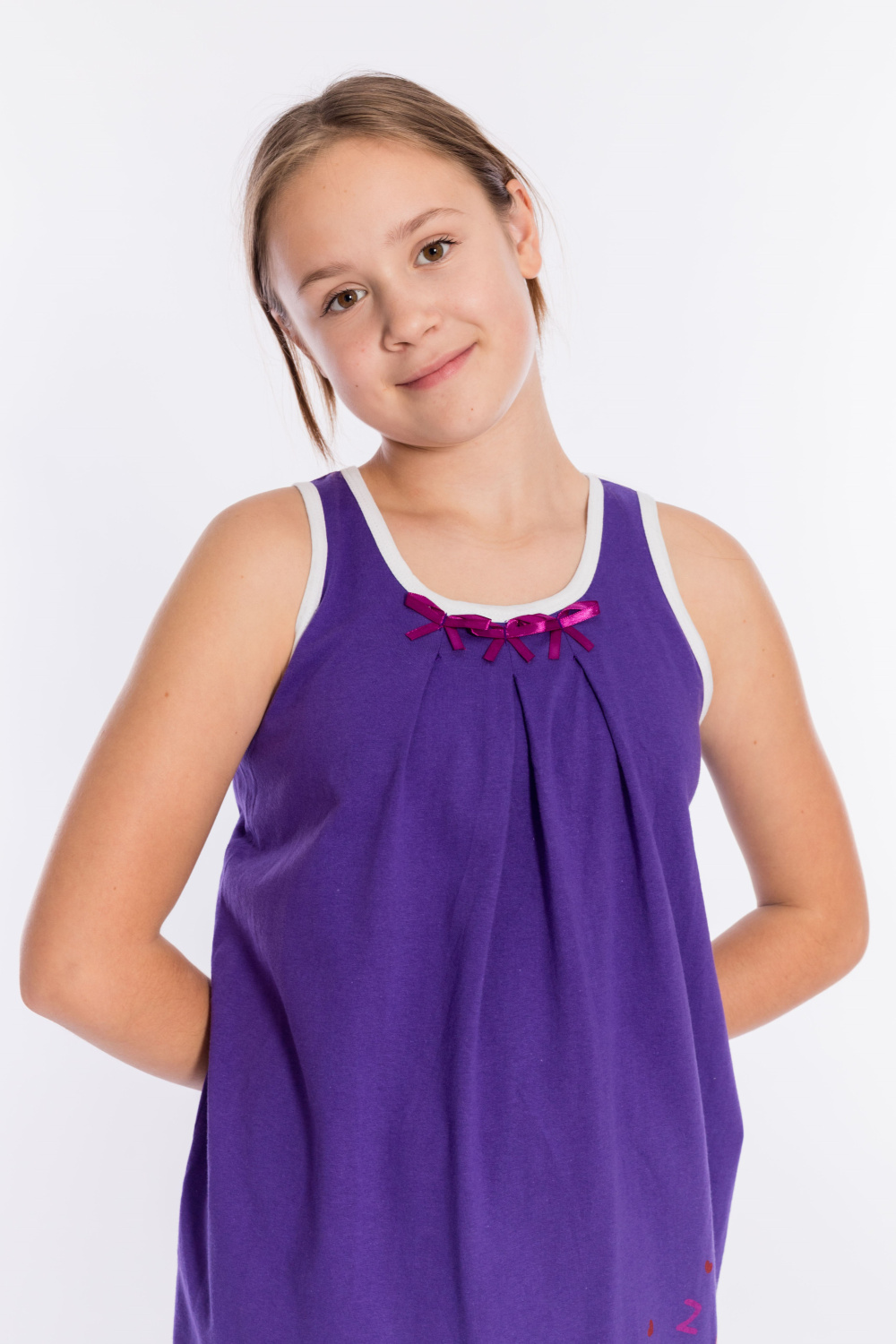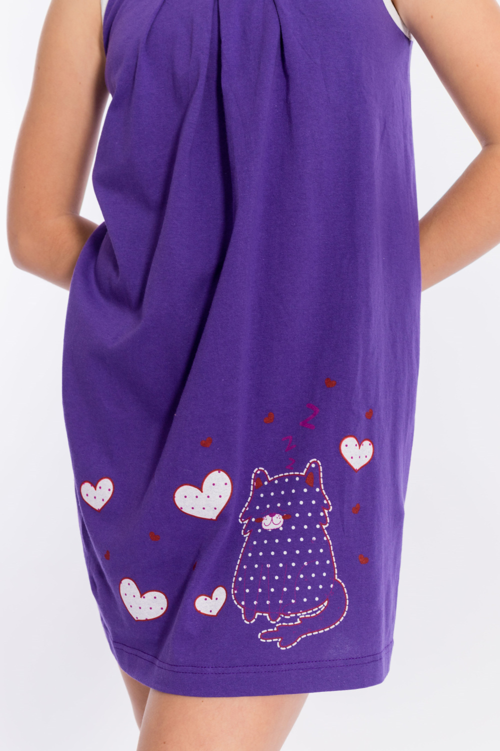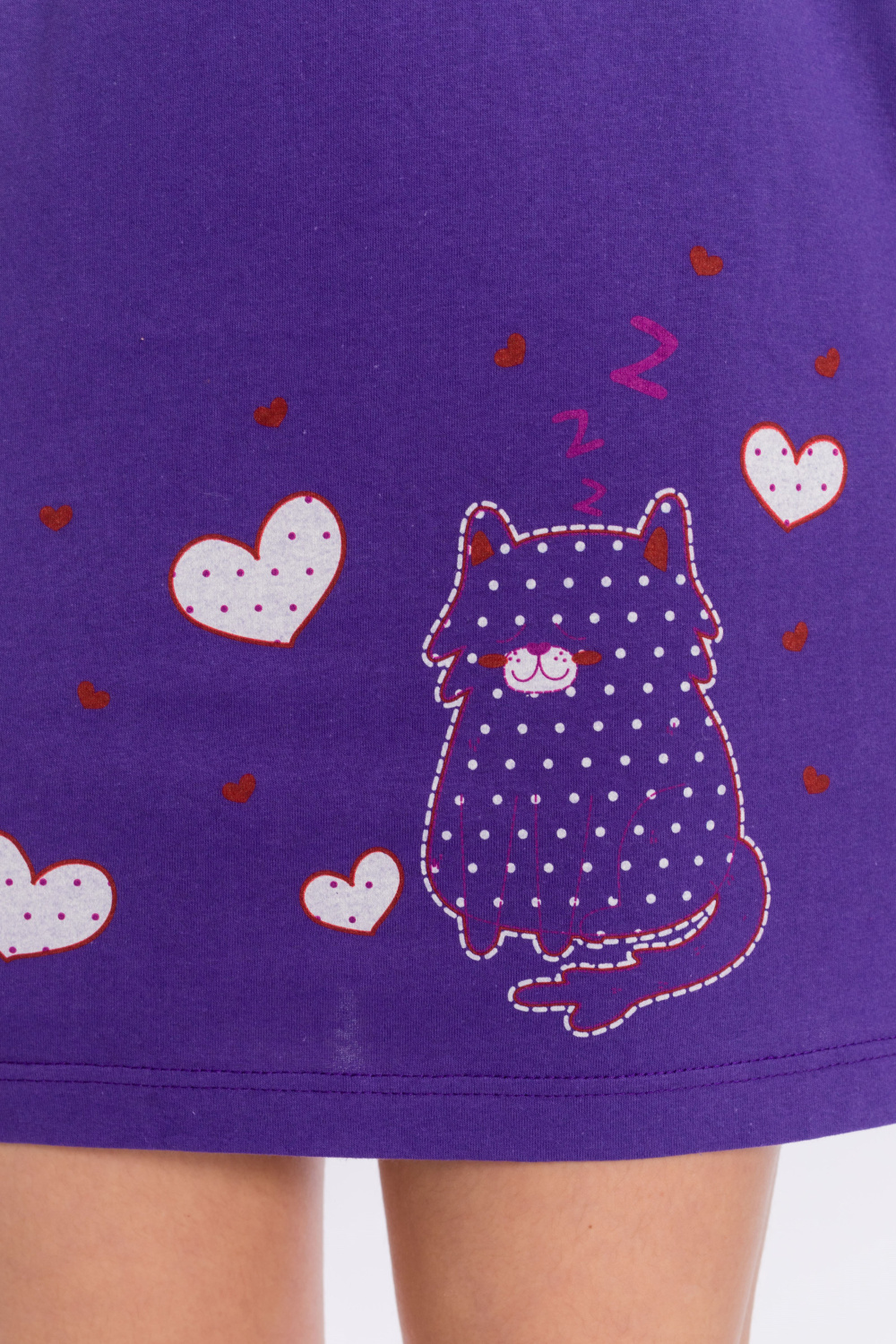 Сорочка из однотонной кулирки. Спереди расположен принт. В качестве отделки бантики и складки по горловине изделия, а также белая бейка в цвет принта.