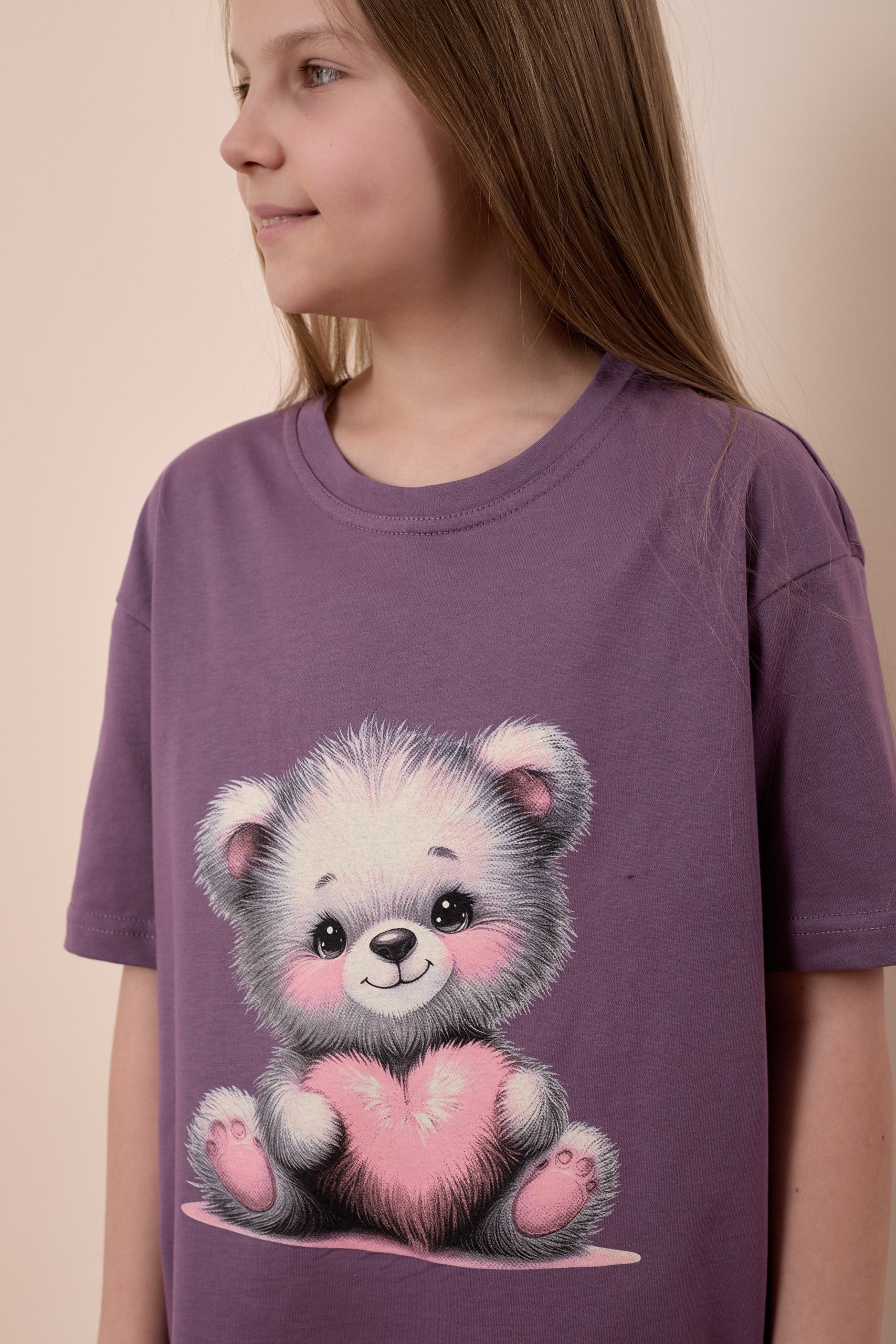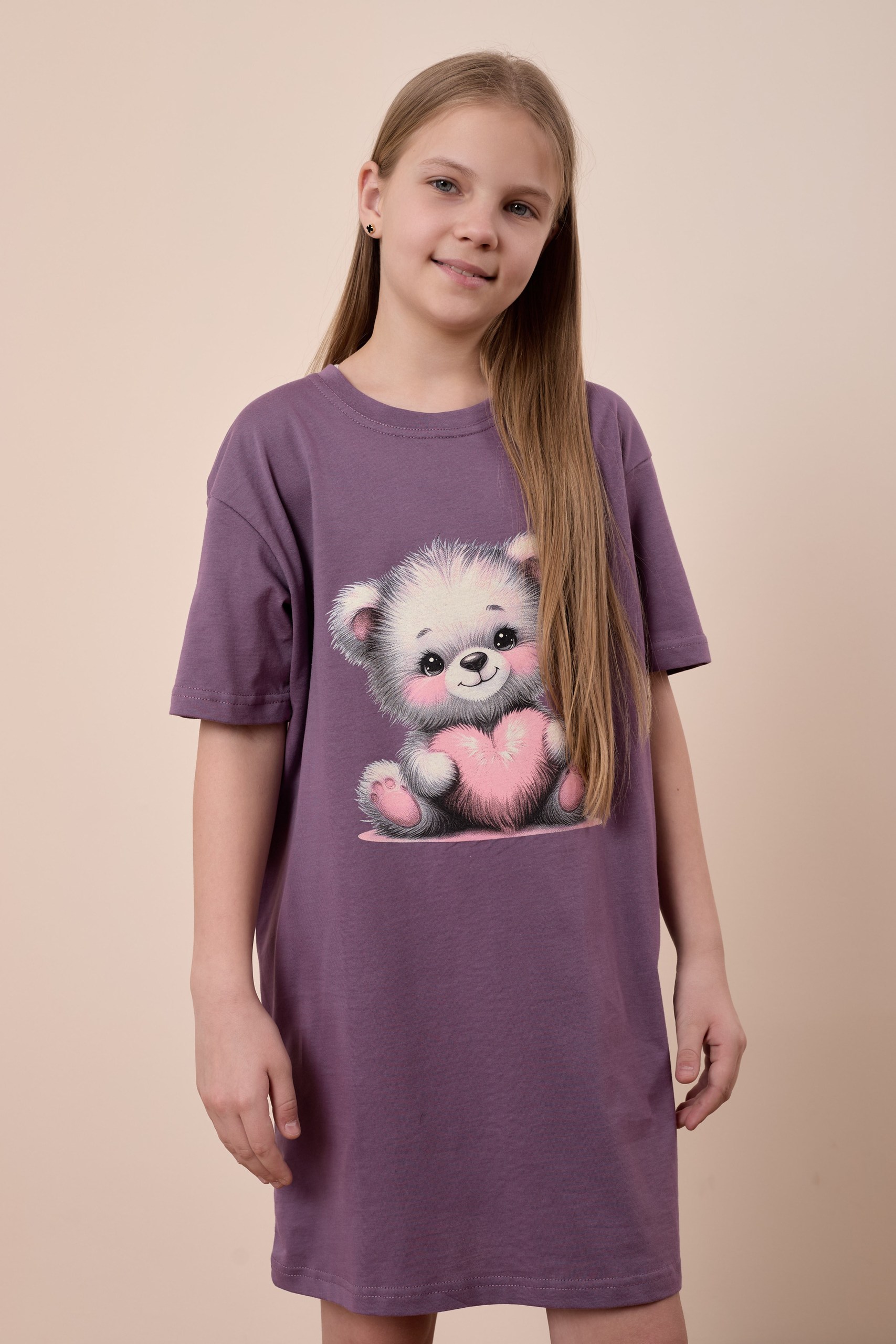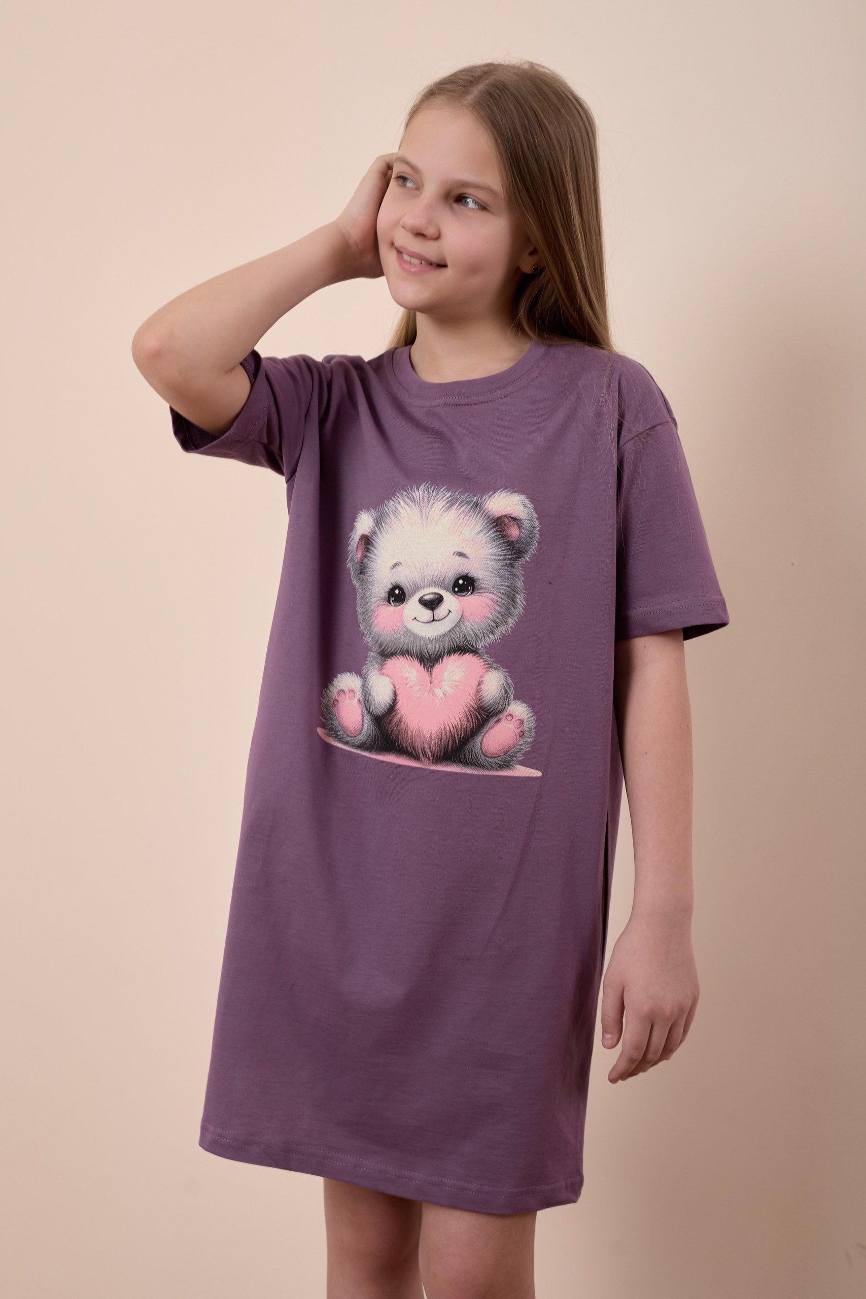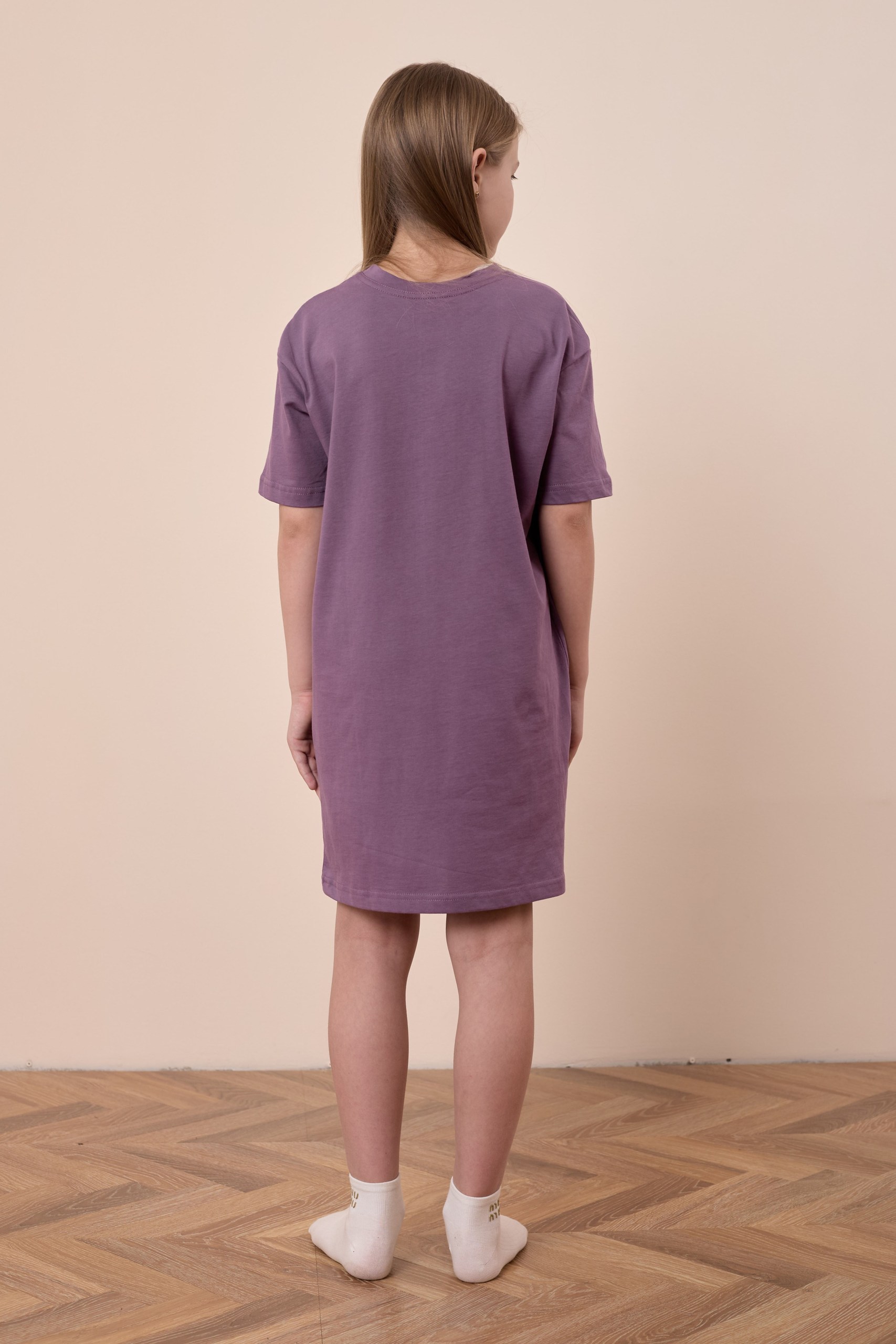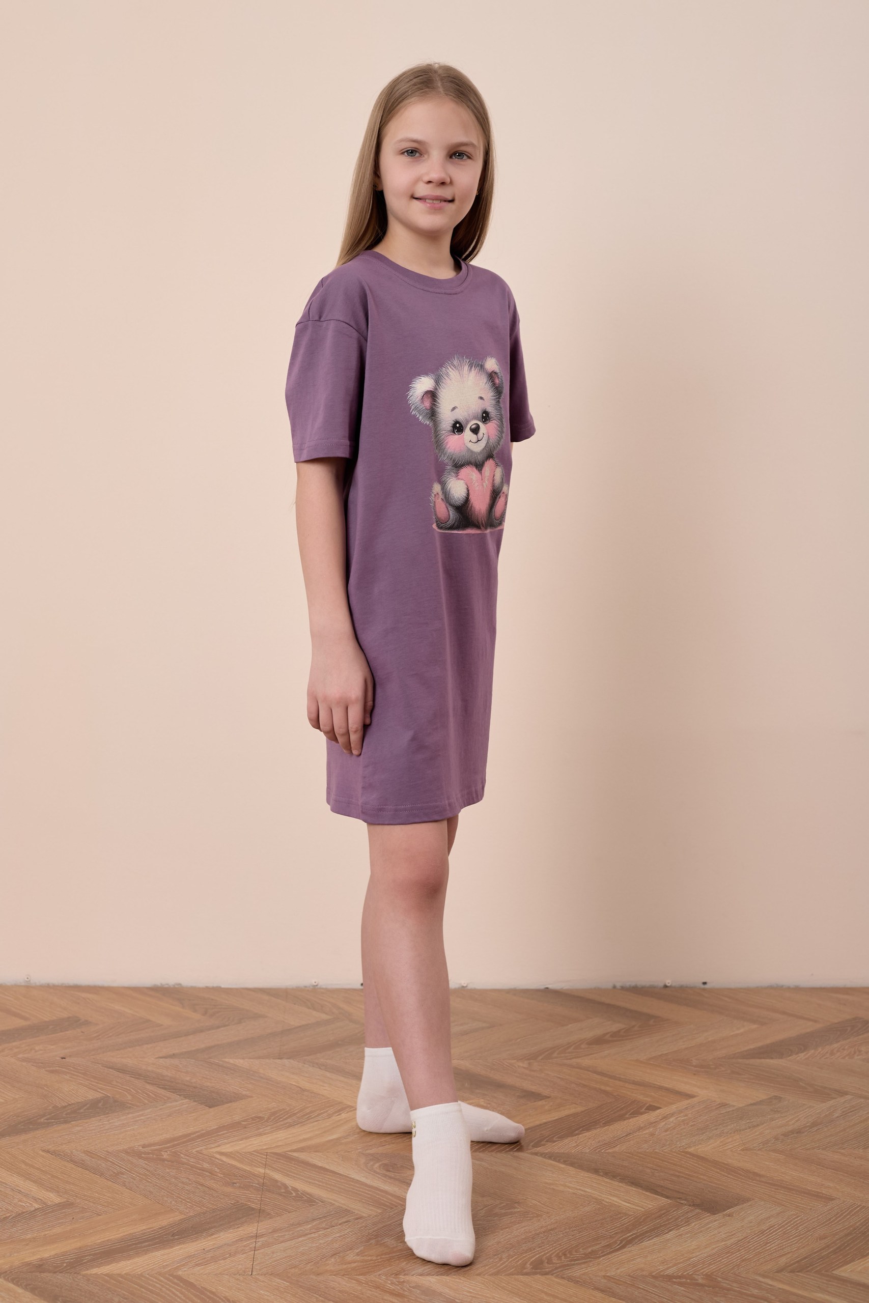 Сорочка-футболка для девочки из однотонной кулирки нежно-сиреневого цвета очаровательна и уютна. Прямой крой с коротким рукавом и круглым вырезом горловины делают ее комфортной и практичной в использовании. Принт на передней части добавляет игривости и оригинальности к изделию, придавая индивидуальность.