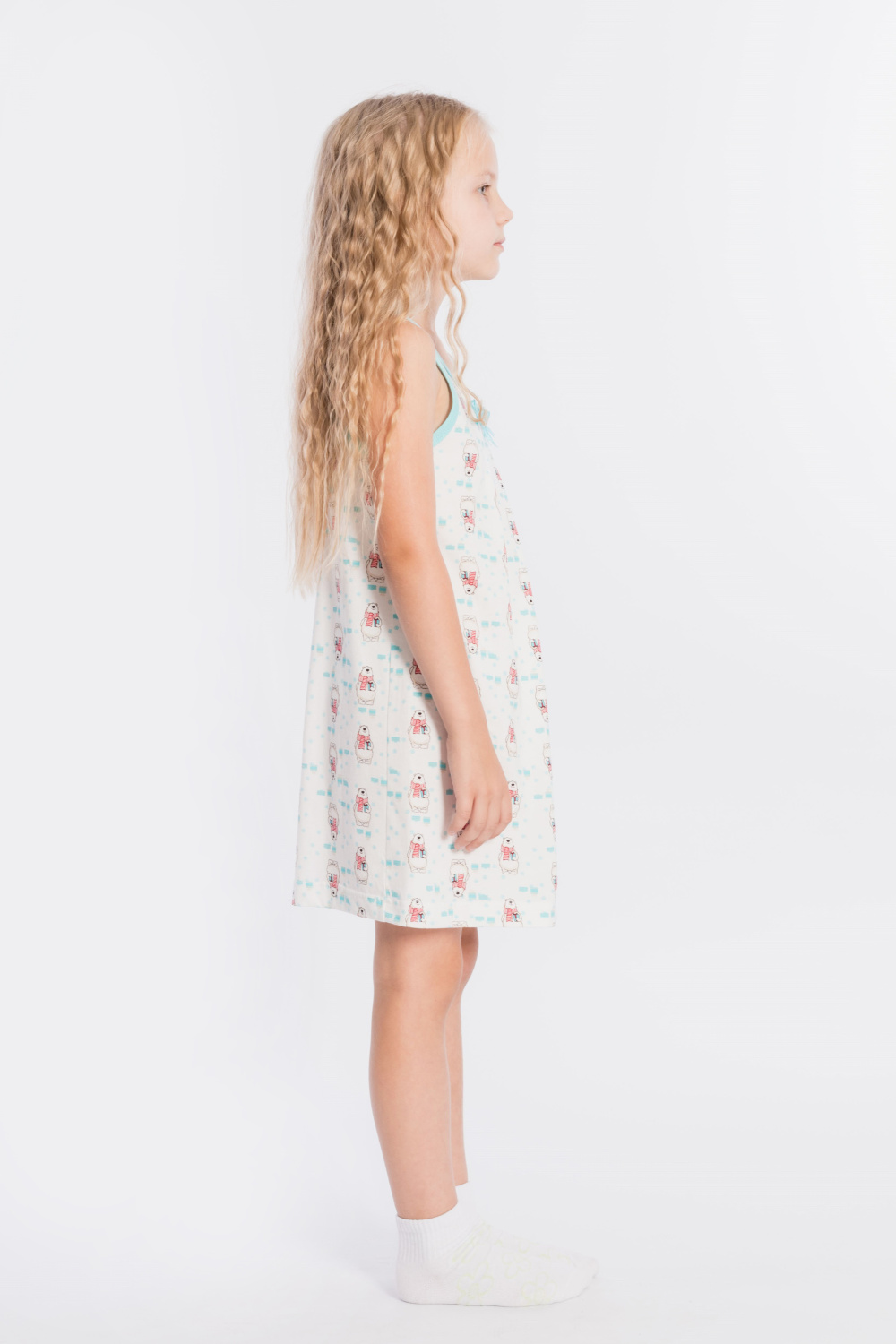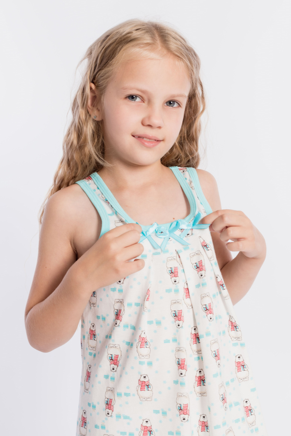 Сорочка детская выполнена из хлопкового полотна, со складками и бантами спереди, горловина и проймы обработаны бейкой.