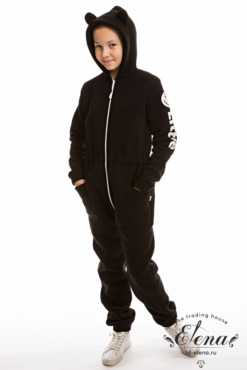 Комбинезон из однотонного футера с начёсом. С капюшоном с "ушками", застёжкой на молнию и накладными карманами спереди. По талии кулиска с резинкой. Рукава и низ брюк с притачными манжетами. Сбоку на рукаве и сзади костюм украшен принтом.