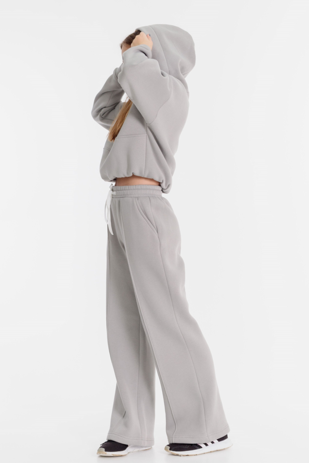 Костюм выполнен из однотонного полотна с начёсом, состоит из свободных, широких брюк и укороченной толстовки. Толстовка с капюшоном и короткой застёжкой на молнии. Линия плеча спущенная, низ толстовки на резинке. Брюки с боковыми карманами и притачным поясом на резине и шнуре, спереди отстрочены стрелки.