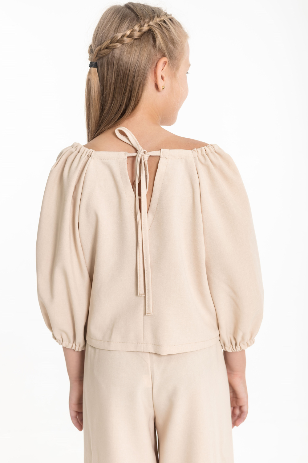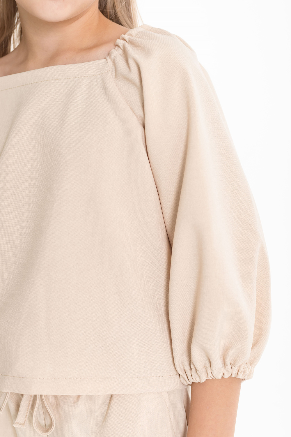Костюм выполнен из искусственного льна. Стильный комплект состоит из блузки с регулируемыми по длине рукавами на резинке и брюк-палаццо на высокой посадке. Брюки дополнены боковыми карманами и эластичным поясом со шнуром для удобной посадки. Идеальный ансамбль для создания модного и комфортного образа.